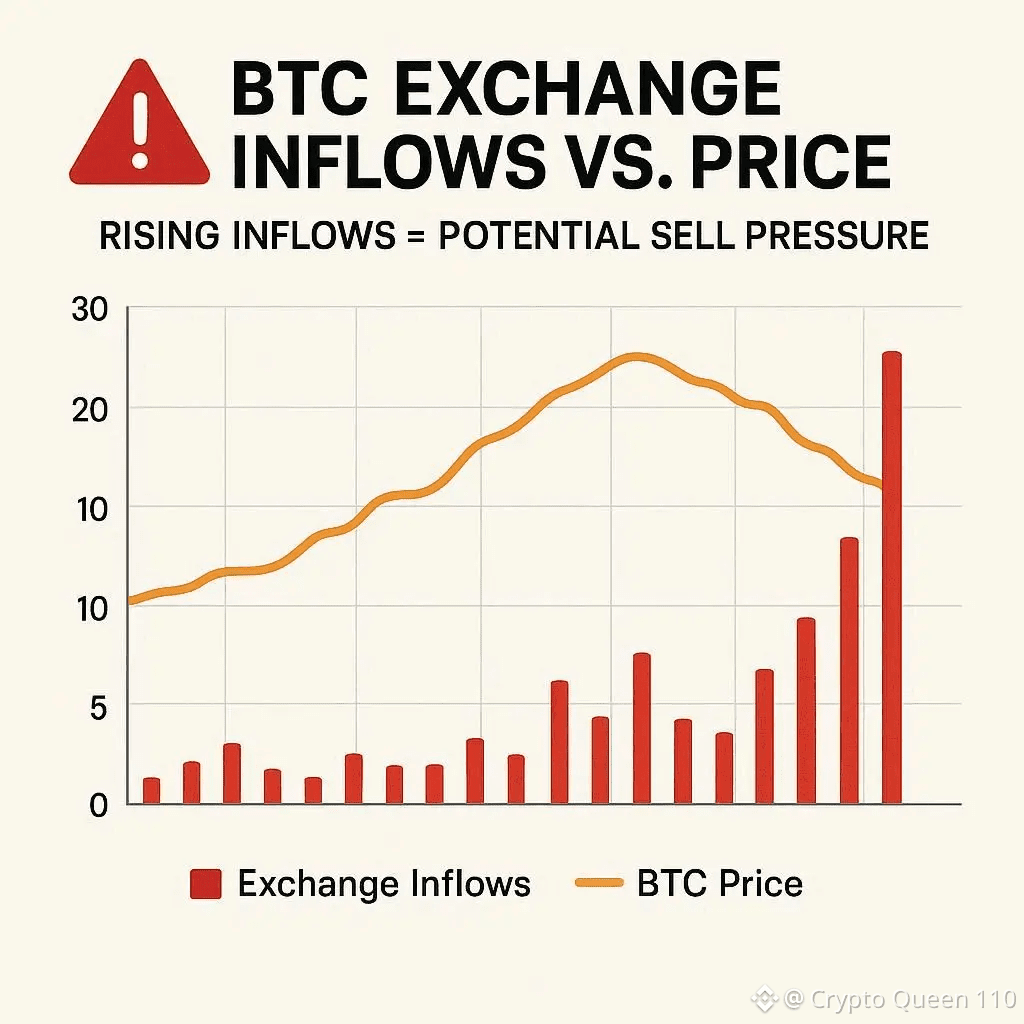 One of the clearest red flags is a spike in **Bitcoin exchange inflows—when large amounts of BTC move from private wallets to exchanges. People typically send coins to exchanges to sell, hedge, or use as collateral. If inflows rise sharply over a short period, it can signal that selling pressure may be building.