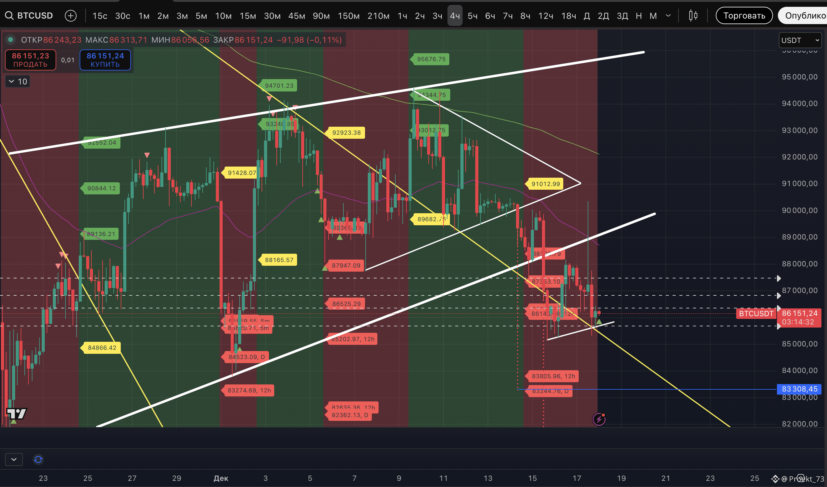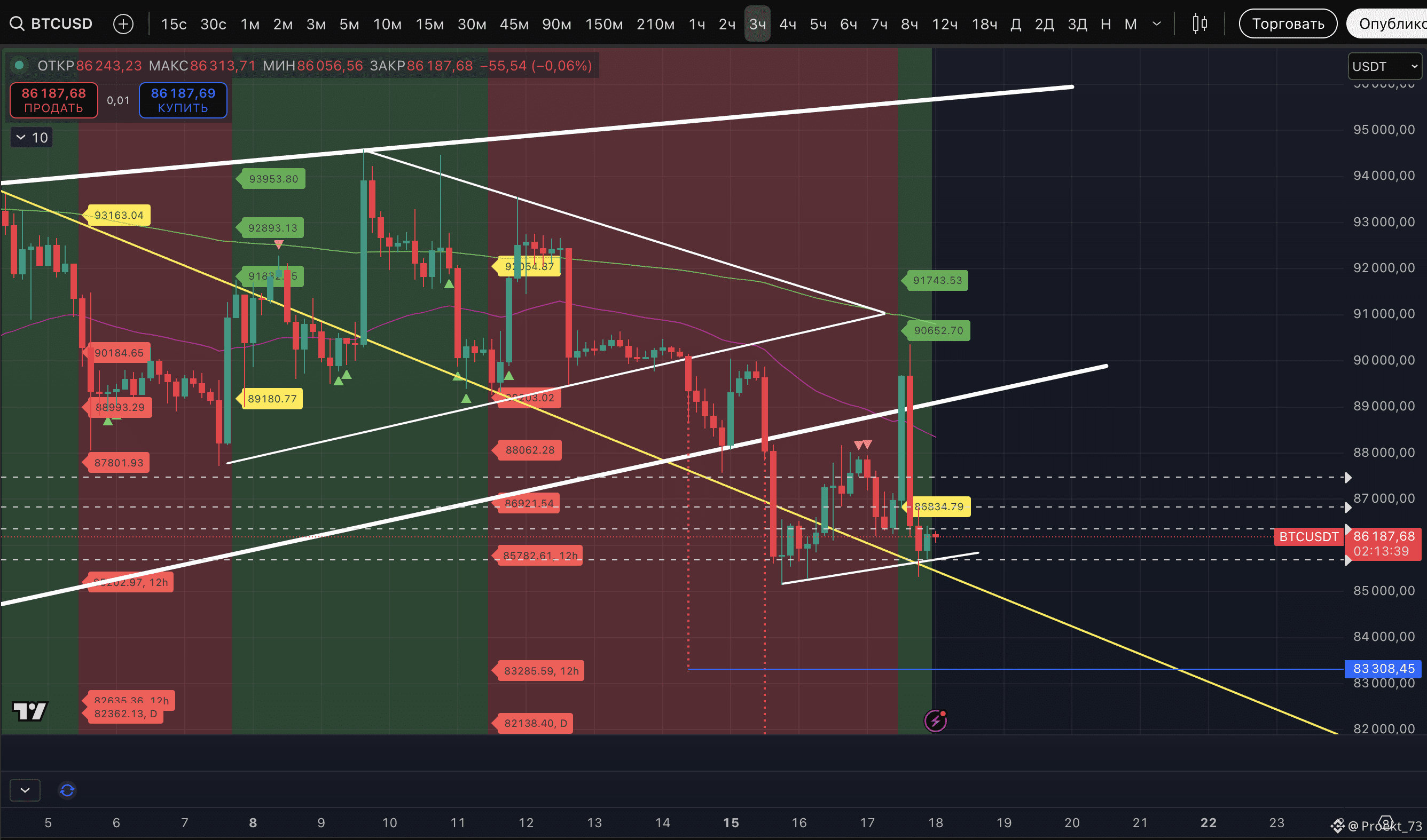 На сейчас наш лонг по BTC имеет среднюю точку входа 86 798,02$ и мы перед ночью поставили стоп в положительный безубыток 86 818$, ожидая отскока. НО открывшиеся только что 4-часовая и дневная свечи заставили изменить планы.