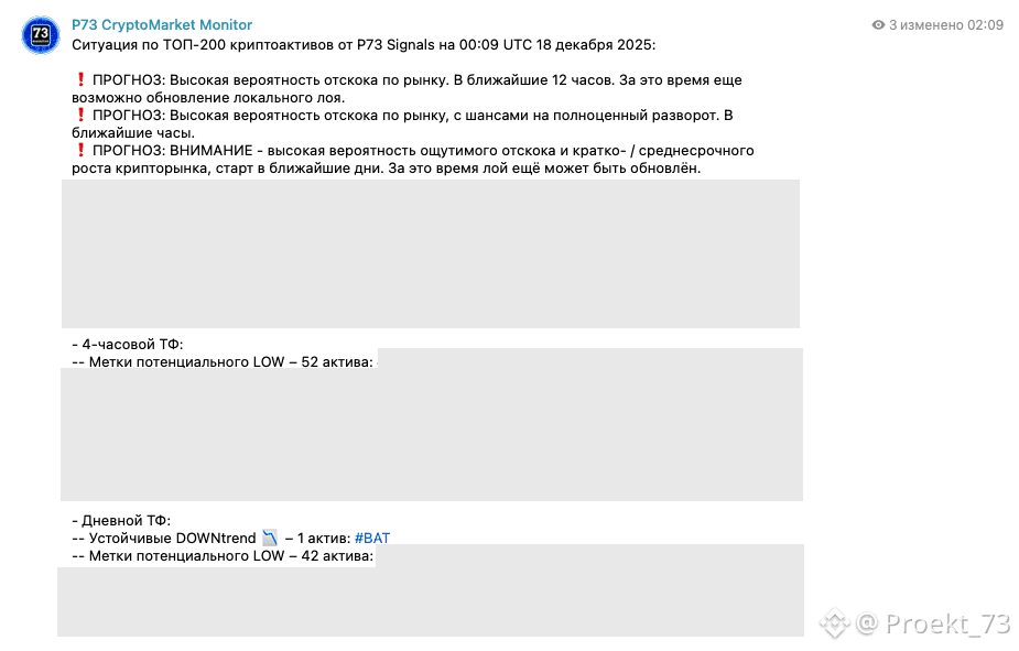 Все это рисково с учетом того, что на 2/3 объема мы уже в позиции и добавлять почти нечего. Плюс ждем триггера для рынка, который несет с собой неизвестная тема выступления Трампа через полтора часа. При негативе для рынков - в моменте протянуть ниже. Но мы доверимся сигналам разворота, который только что дал которые только что дал P73 CryptoMarket Monitor. Он позволяет ждать рост в четверг и далее. НО вопрос поставлен ли лой сегодня, 18 декабря, - при этом открытый.