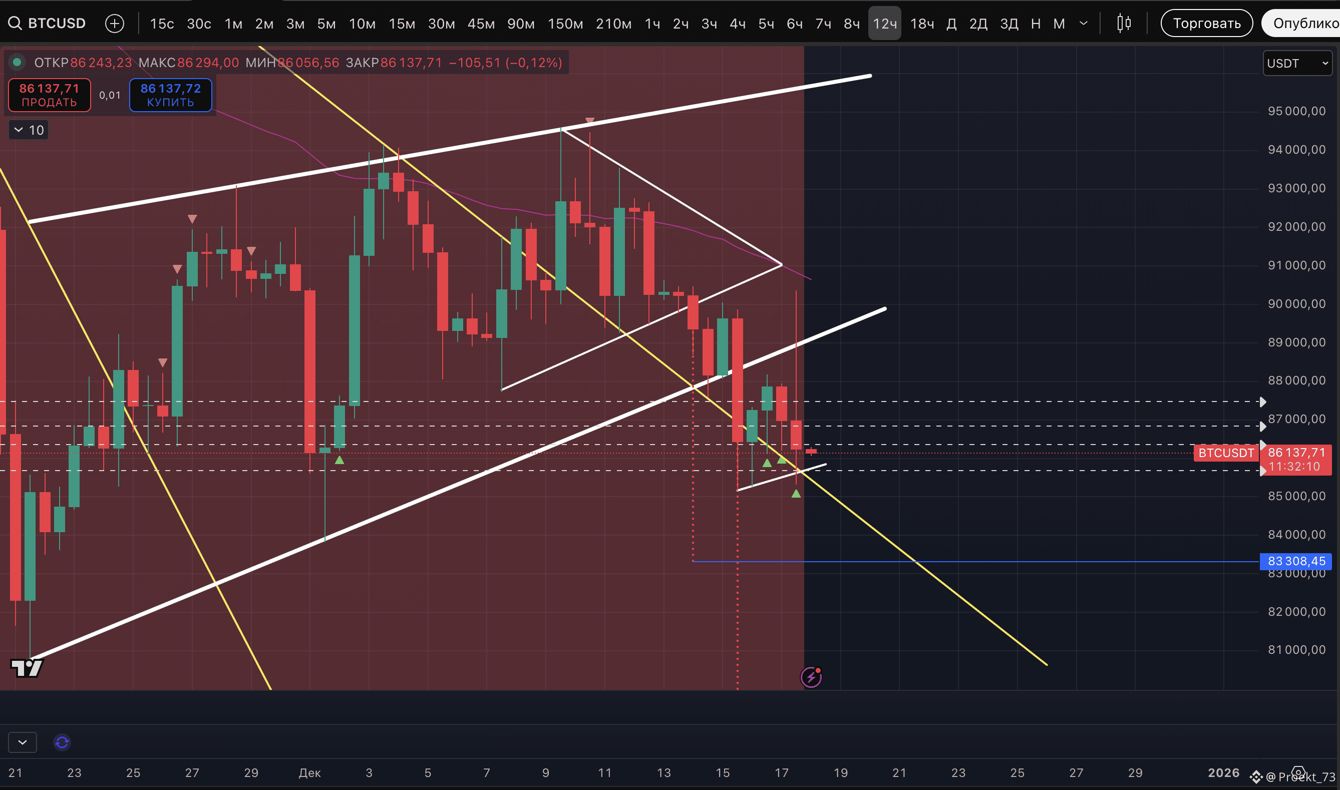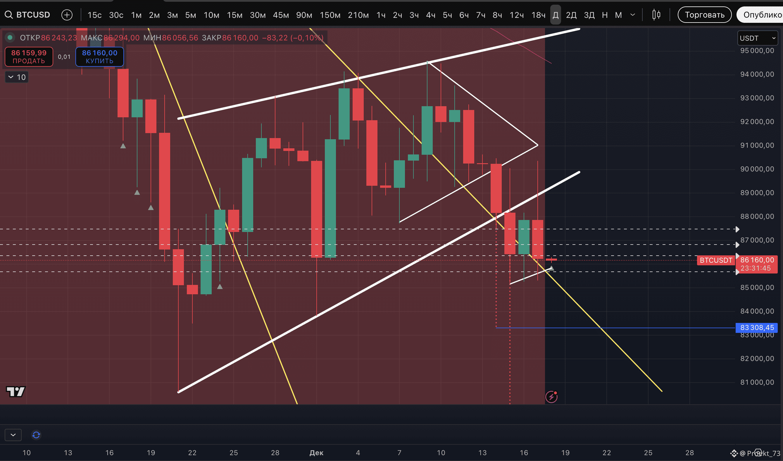 ps: Если аптренд по BTC на 3-часовом ТФ будет потерян - значит будем искать возможность для закрытия лонга, потому что основным сценарием станет перелой с неопределенными перспективами по лою. Ведь, если говорить о дневном ТФ - там только первая метка потенциального лоя. А их может быть до трех. То есть на поиск дна может уйти 18-20 декабря.