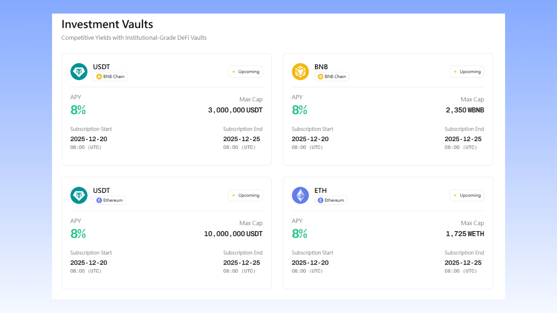 Поддерживаемые активы: BNB, ETH, USDT (BNB Chain и Ethereum имеют разные общие лимиты на депозиты)