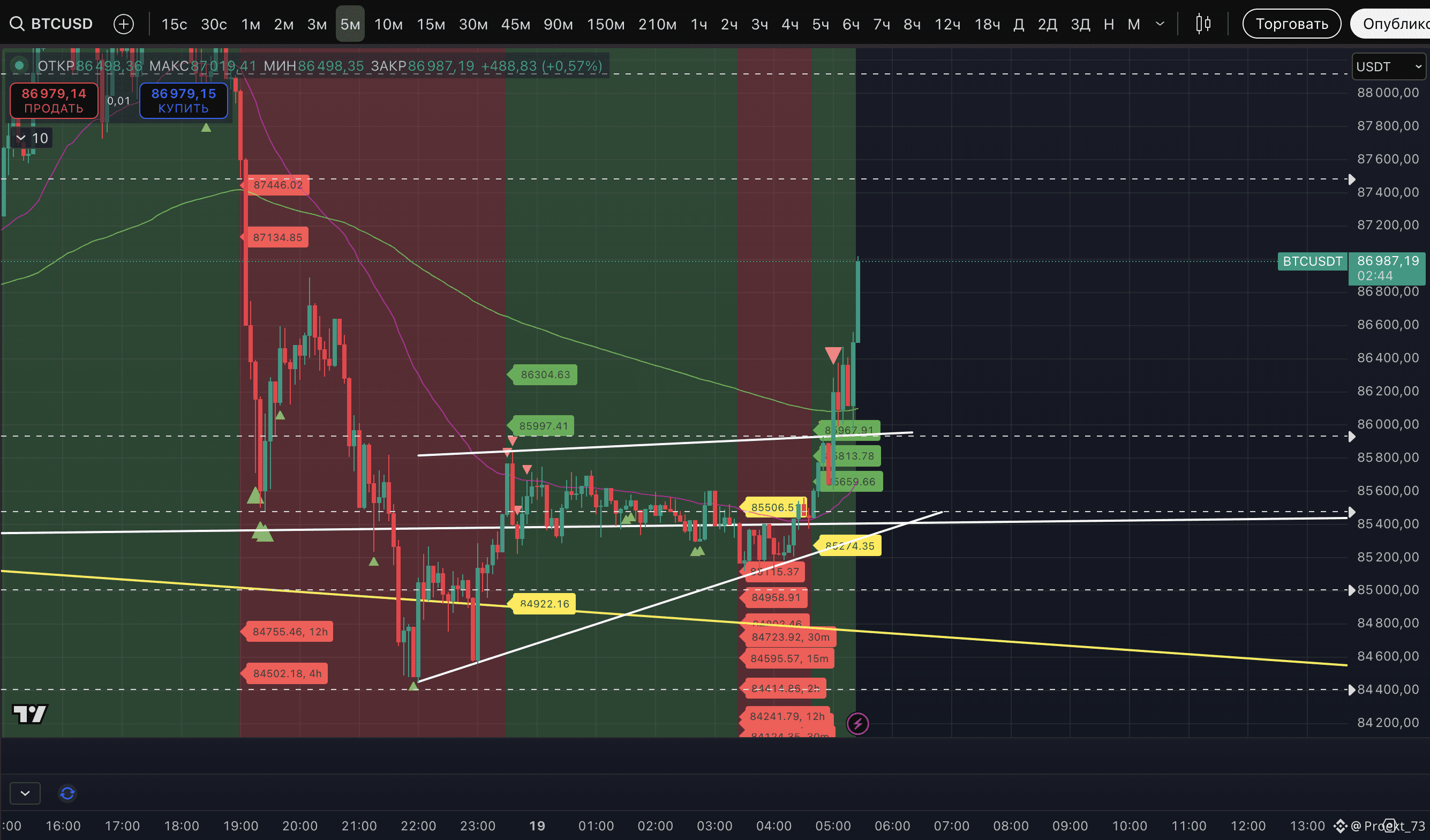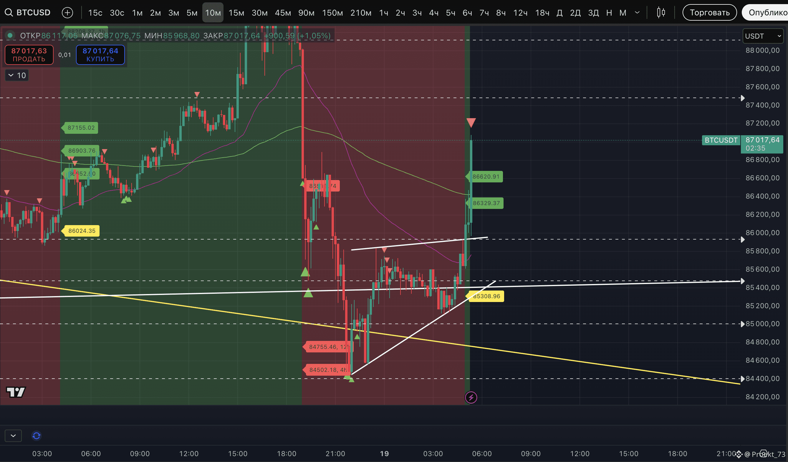 Курс BTC в последние полчаса перед объявлением решения начал постепенный рост, перед временем объявления сделал паузу, а затем на задержке с публикацией решения пошел ломать, пробивать вверх, "Медвежий клин" с целью в районе 84 000$. Цена перешла в устойчивый аптренд на 5-, 10- и 15-минутном ТФ и показала Strong signal потенциального хая на 5- и 10-минутном ТФ. Есть пробой 87 000$.