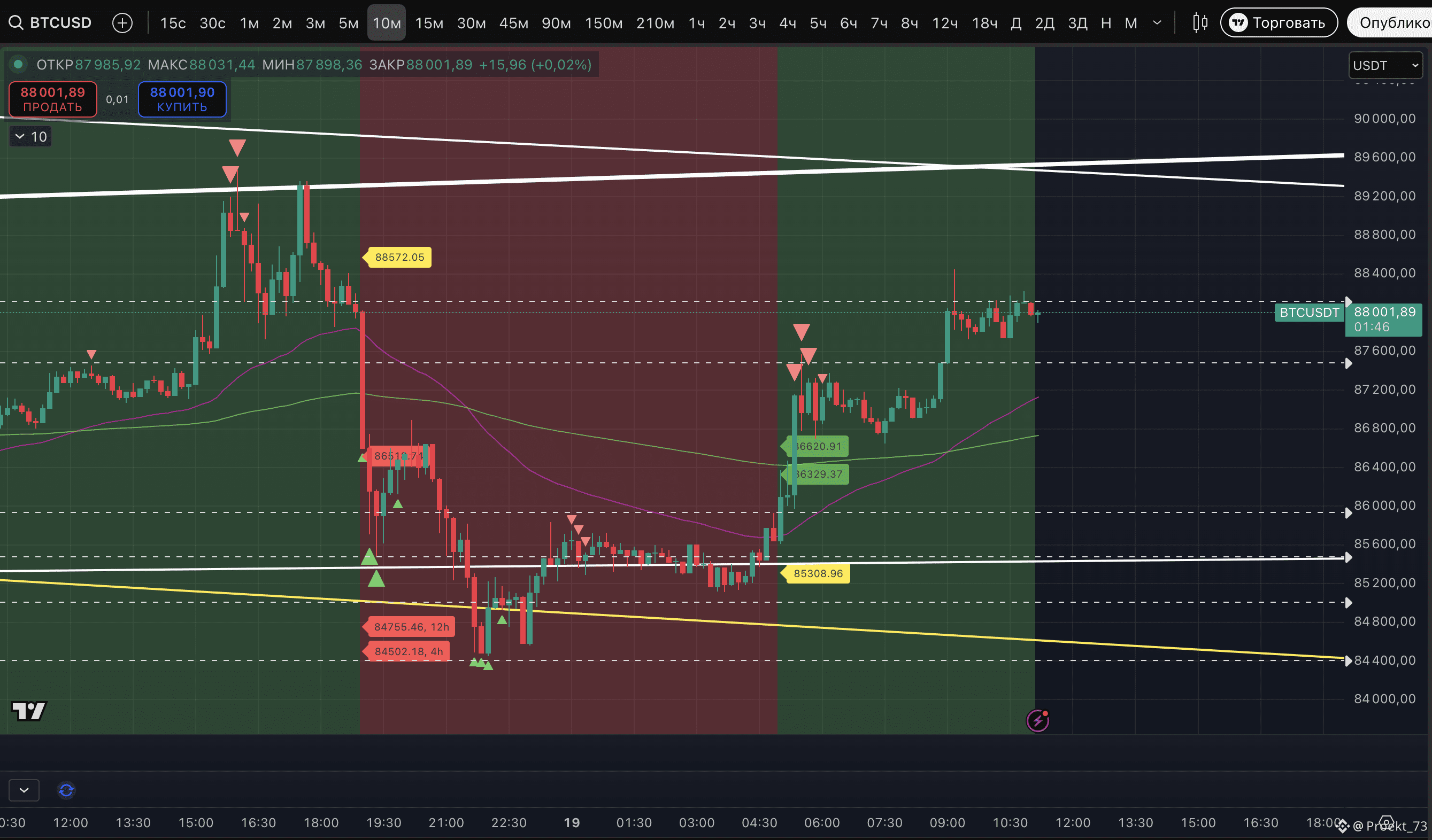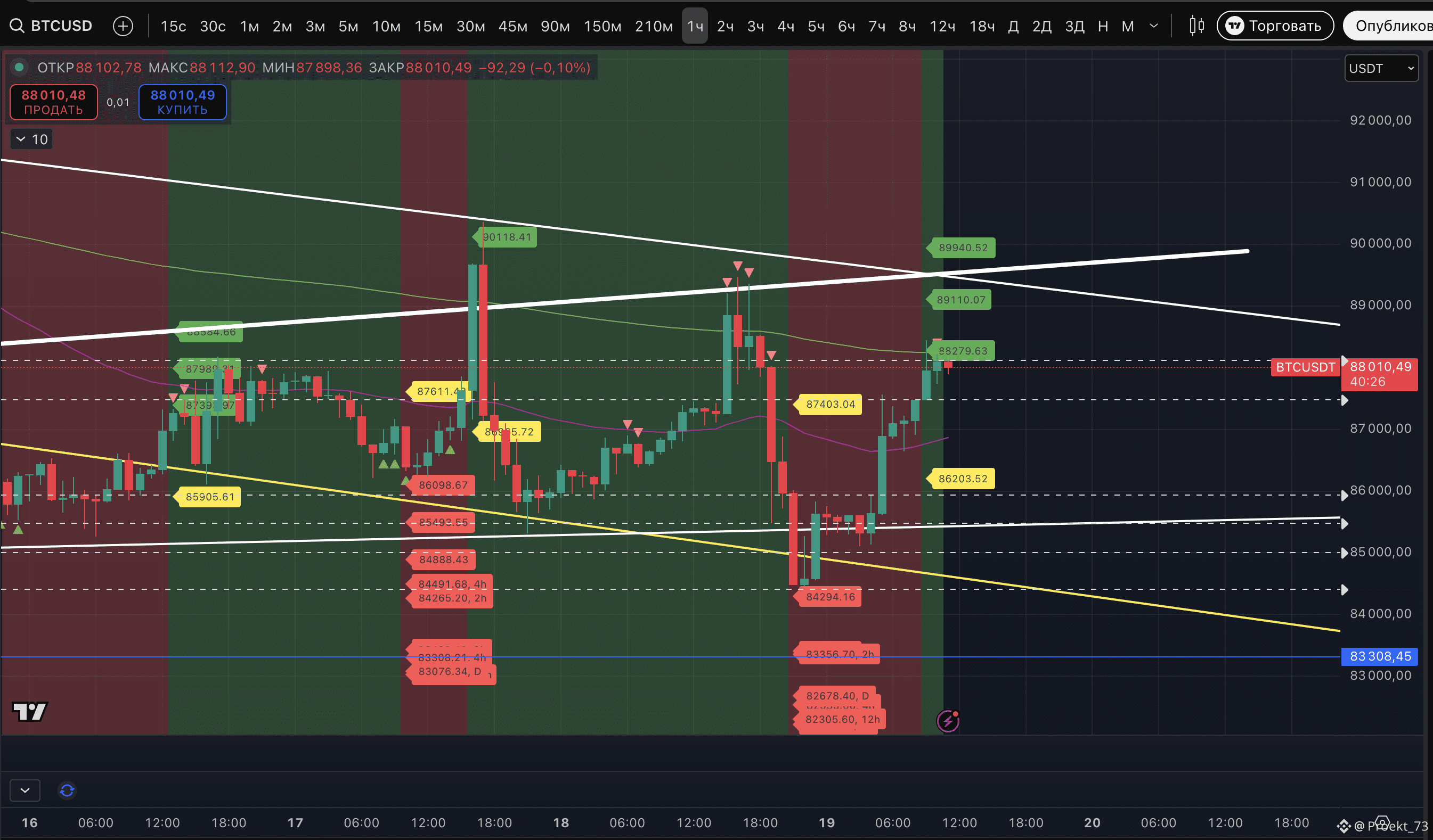 Пока наибольшее достижение по аптрендам у BTC - это часовой ТФ. Там устойчивый аптренд с еще не отработавшими целями 89 110$ и 89 940$. НО при этом уже вторая метка потенциального хая.