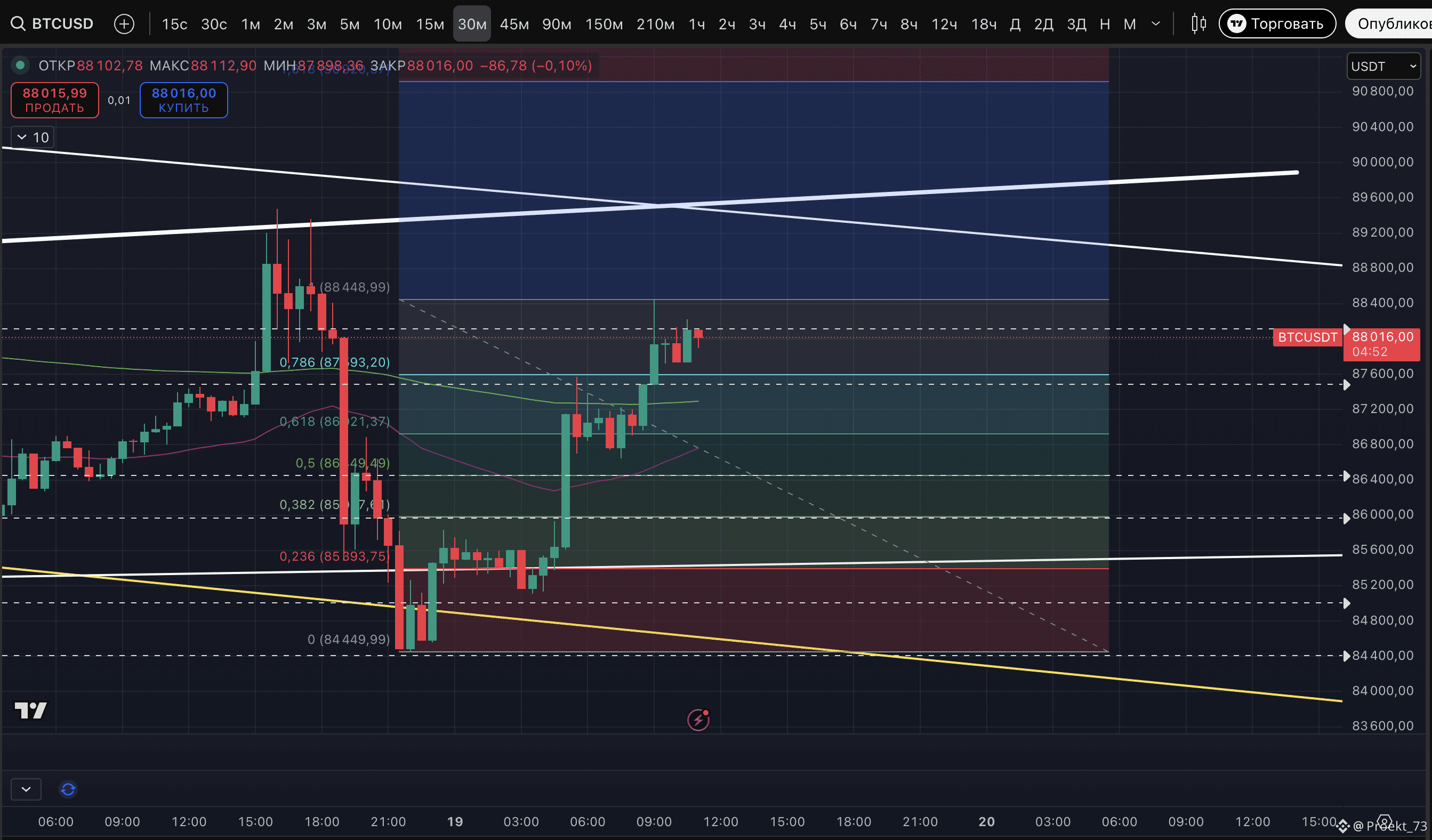 Поэтому рабочая гипотеза сейчас - это коррекция импульсного роста. Конкретно по BTC оптимально не терять уровень 0.5 по Фибоначчи этого отскока, курс 86 449$. В крайнем же случае - уровень 0.382, курс 85 977$.