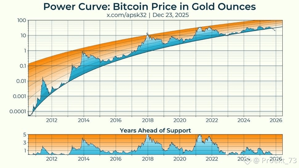 Другой аналитик в Х, apsk32, обращает внимание - график цены #BTC, выраженной в золоте, показывает редкое явление - отклонение от долгосрочной степенной кривой роста.