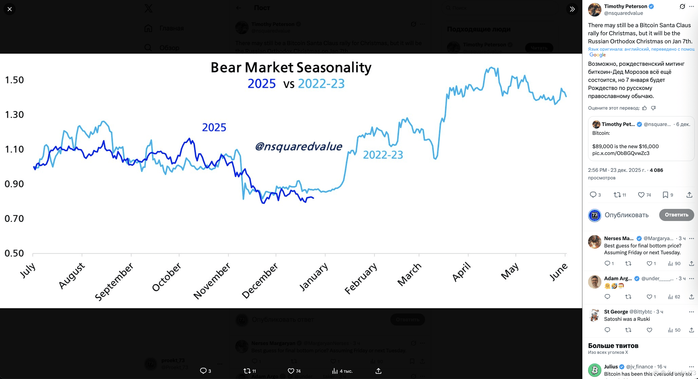 График Тимоти Петерсона показывает, что текущая траектория BTC в конце 2025 года структурно повторяет поведение рынка в 2022 году.