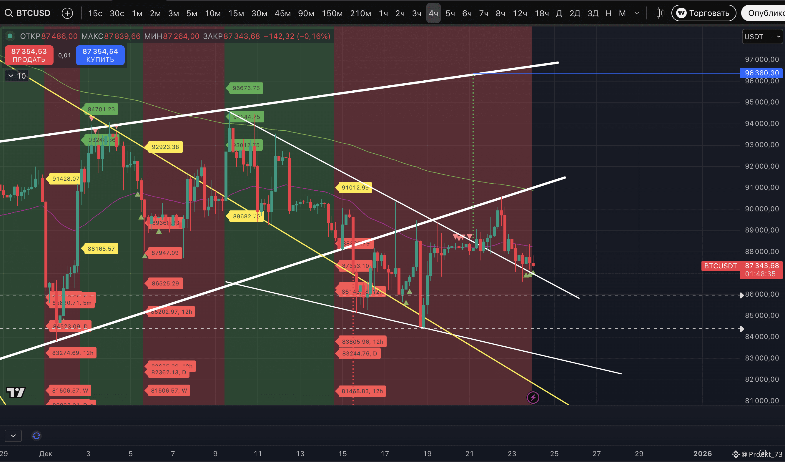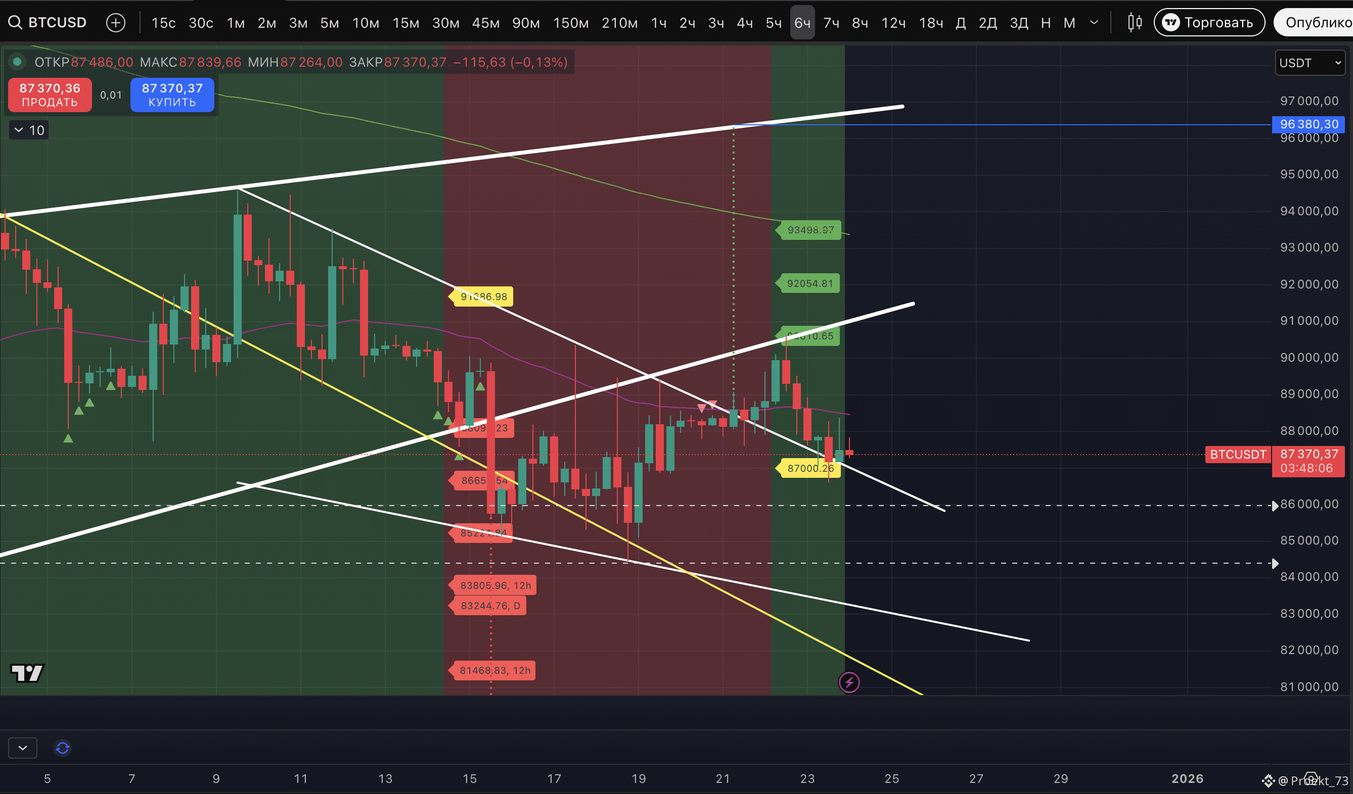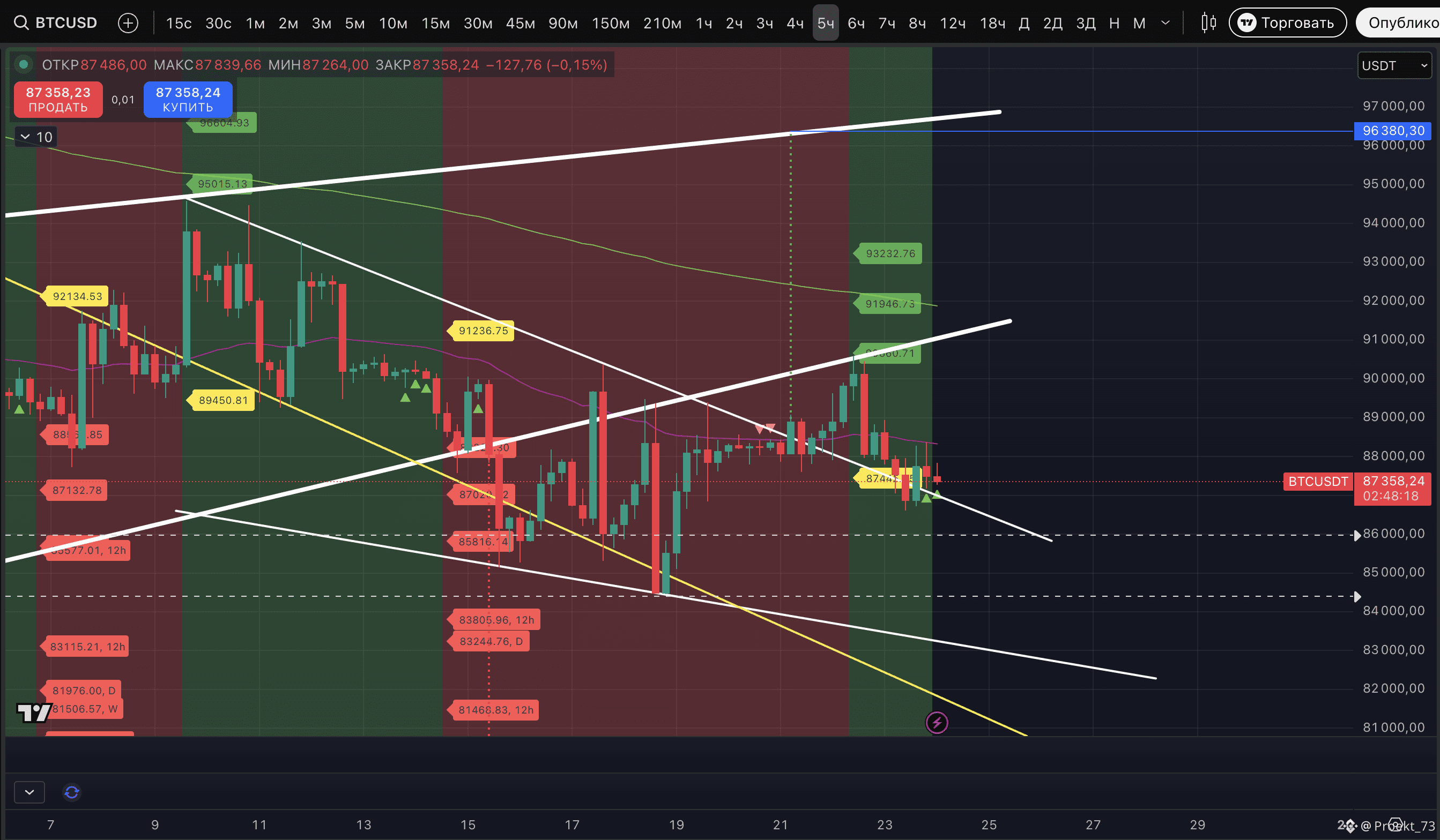 На сейчас у #BTC, например, уже три метки потенциального лоя на 4-часовом ТФ. При этом цена удержала трендовую поддержку - верхнюю часть "Бычьего клина" с полной целью 96 380$.