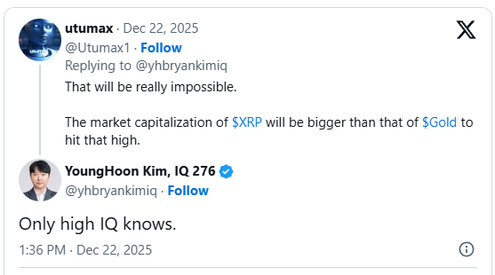 Учитывая эти последствия, другие участники рынка оспорили прогноз Кима. Пользователь X Utumax утверждал, что достижение XRP $1,000 подразумевает рыночную капитализацию больше, чем у золота. Соответственно, он назвал сценарий нереалистичным.