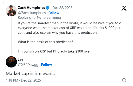 Тем временем YouTuber Зак Хамфрис попросил Кима объяснить подразумеваемую рыночную капитализацию XRP при $1,000 и изложить методологию, стоящую за прогнозом. Хамфрис отметил, что, хотя он остается оптимистичным в отношении XRP, он был бы удовлетворен движением к $100 в течение следующего десятилетия. Интересно, что другие комментаторы утверждают, что "рыночная капитализация не имеет значения".