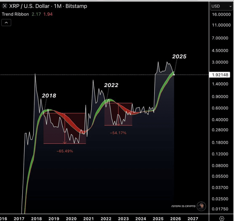 ✨ Шаблон довольно прост, если посмотреть на графики. В 2018 году XRP упал ниже этой ленты и затем был сильно подавлен — потеряв около 65 процентов своей стоимости в длительном падении. Быстро перемотав на 2022 год, произошло то же самое. XRP снова упал ниже ленты и потерял примерно 54 процента. Оба раза пересечение этого уровня было не просто быстрой просадкой. Это ознаменовало начало серьезного нисходящего импульса, который длился месяцами.