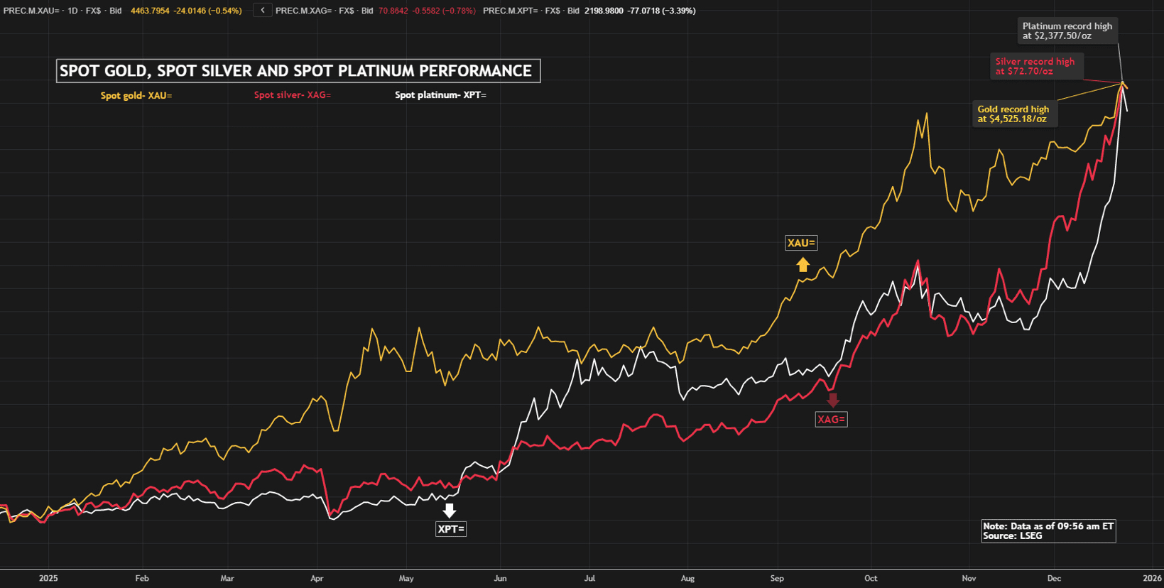 Текущие цены на спот (по состоянию на закрытие 24 декабря / последние котировки): Золото (XAU/USD): приблизительно $4,480–$4,495 за тройскую унцию. Цены на золото кратковременно превысили $4,500 во время сессии 24 декабря (достигнув нового рекорда около $4,525), но немного откатились на фоне фиксации прибыли на серебре (XAG/USD): приблизительно $71.90–$72.15 за тройскую унцию. Серебро также достигло нового рекорда в $72.70 24 декабря, прежде чем немного снизилось. Итоги производительности 2025 года: золото выросло примерно на 70% с начала года, на пути к своему сильнейшему годовому приросту с 1979 года. Серебро значительно превзошло золото, увеличившись на 140–150% с начала года, благодаря как спросу на безопасные активы, так и прочному промышленному использованию (например, солнечные панели, электромобили, электроника). Факторы, способствующие ралли: Геополитические напряженности: Эскалация действий США против Венесуэлы (например, захваты танкеров с нефтью) и продолжающиеся глобальные риски увеличили спрос на безопасные активы. Денежно-кредитная политика: Ожидания дальнейших снижений процентных ставок ФРС в 2026 году, в сочетании со слабым долларом США (значительно упавшим в 2025 году). Факторы спроса: сильные покупки золота центральными банками, приток средств в ETF и структурный дефицит предложения серебра плюс промышленный спрос. Динамика в конце года: слабая праздничная торговля усилила волатильность, что привело к нескольким рекордам в декабре. Ожидается, что рынки вновь откроются 26 декабря, когда новые экономические данные (например, задержанные индикаторы США) могут повлиять на цены. Аналитики остаются в целом оптимистичными в отношении 2026 года, некоторые прогнозируют золото на уровне $4,900–$5,000, а серебро может подняться еще выше на фоне продолжающихся фундаментальных факторов. Для получения обновлений в реальном времени после праздников проверяйте надежные источники, такие как Kitco, Trading Economics или Reuters.