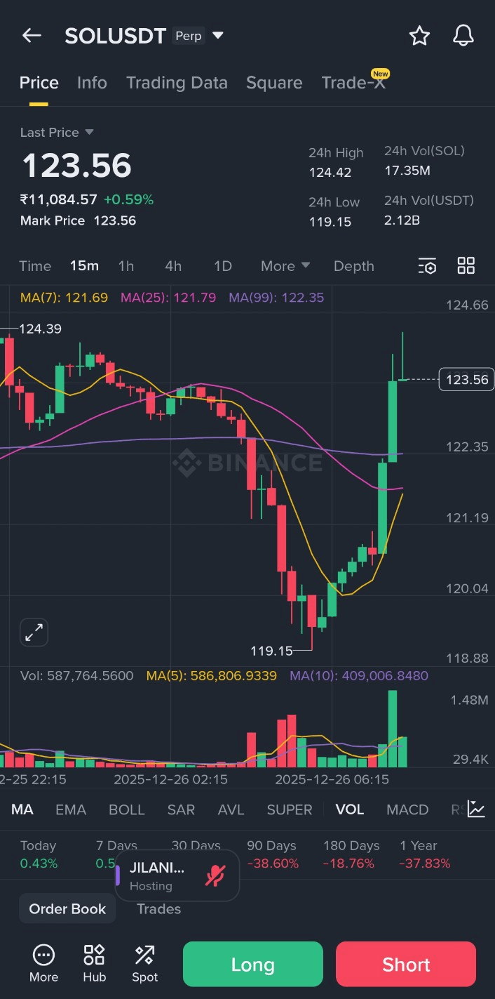 Важно: это график бессрочного контракта (Perp), который включает в себя кредитное плечо. Поскольку цена резко возросла, период "охлаждения" или небольшого отката для повторного тестирования уровня 122.00 является обычным.