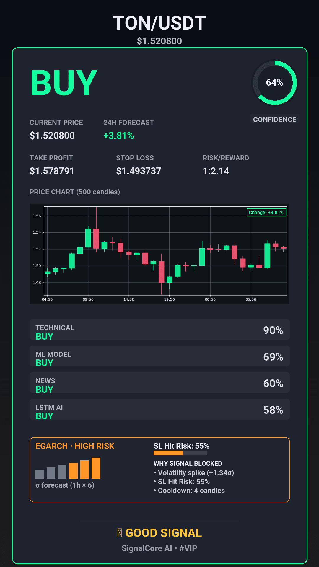 СИЛЬНЫЙ СИГНАЛ ДЛЯ ПОКУПКИCORE AI 2025TON/USDT → ПОКУПКАУверенность: 63.7%Цена: 1.520800 USDTПрогноз 24ч: +3.81%TP: 1.578791 │ SL: 1.493737R:R → 1:2.14Риск срабатывания SL: 55% (ВЫСОКИЙ)EGARCH ВЫСОКИЙ РИСК • Всплеск +1.3σ • Охлаждение 4чАналитика на изображении • #VIPОтказ от ответственности: Не финансовый совет • DYOR#Прогноз #USGDPUpdate Крипто #Торговля