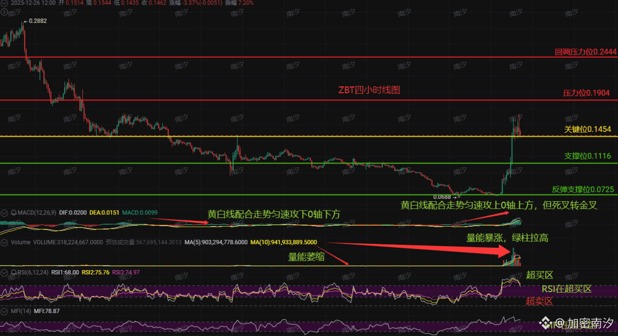 今天ZBT这个走势真的有点意思。一小时图看着还在跌,但MACD黄白线已经悄悄从水下爬上来了,死叉眼看要变金叉——这是要反转了吗?别急,南汐给你拆开看。