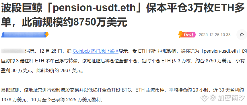 有个叫 pension-usdt.eth 的巨鲸,刚刚平掉3万枚ETH多单,小赚30万美金。这人可不是一般人,近一个月赚了1300多万美元,手法狠、跑得快。他为什么要在这个位置平仓?是不是嗅到了什么风险?这里我先卖个关子,文末告诉你。