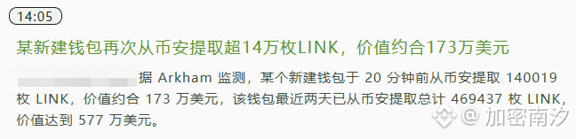 今天盯盘时发现一个诡异现象——有个新建钱包,短短两天从币安提走近47万枚LINK,价值577万美元。巨鲸暗中接盘,是看好后市,还是在布一个更大的局?