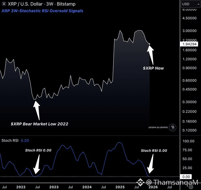 XRP's 3-week Stochastic RSI hits 0.00, repeating a pattern seen at the 2022 market low.