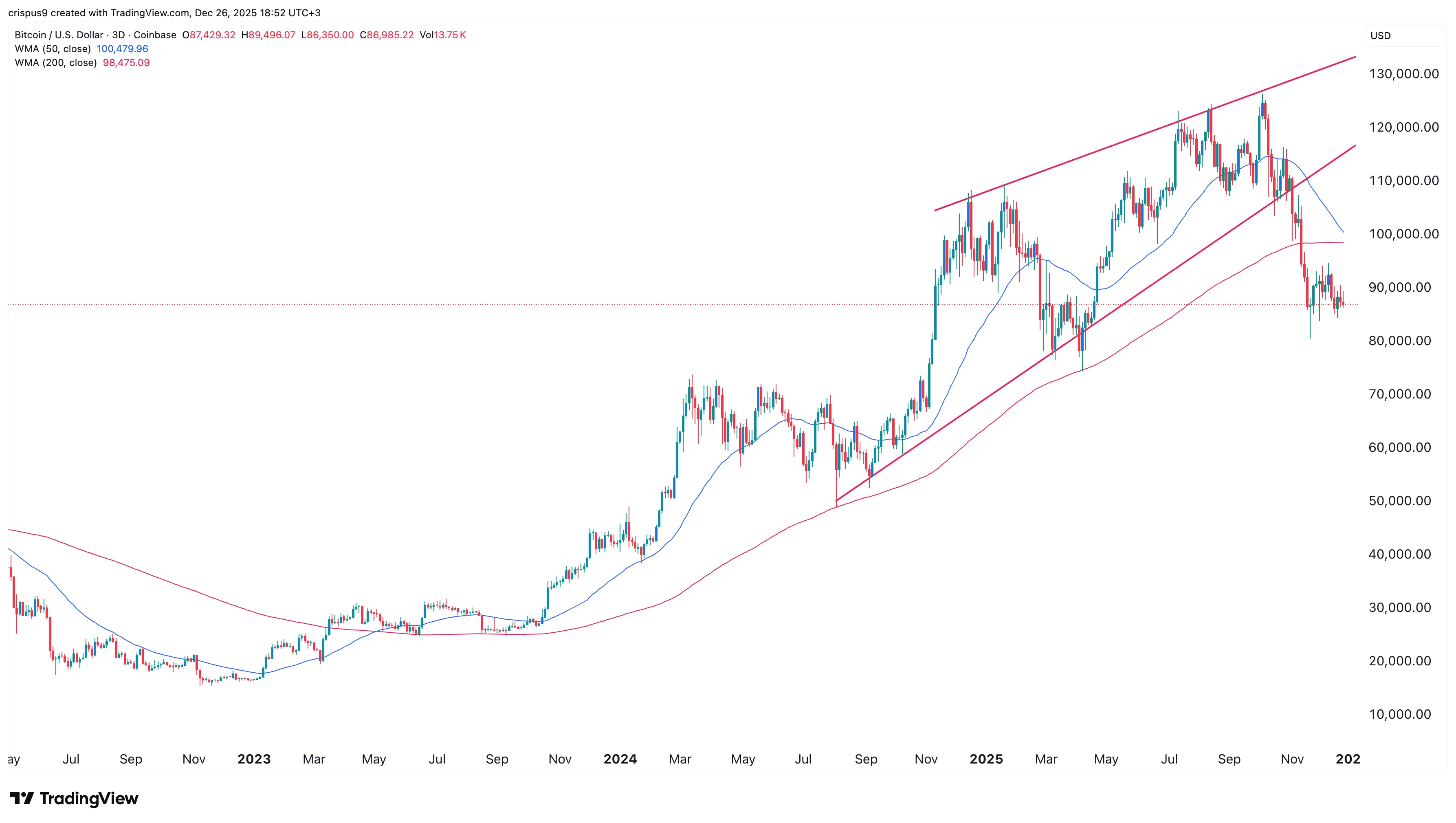 Также, вероятно, скоро образуется «смертельный крест», так как разница между 50-дневными и 200-дневными взвешенными скользящими средними сужается. Следовательно, монета рискует упасть, потенциально до ноябрьского минимума в 80,000 долларов. Падение ниже этого уровня укажет на дальнейшее снижение, потенциально до 75,000 долларов.
