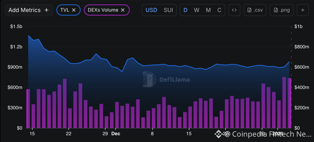 Recent DeFiLlama data highlights a divergence between Total Value Locked (TVL) and decentralized exchange (DEX) volume, offering insight into current market sentiment. TVL has stabilized near the $900 million–$950 million range after a sharp December decline, suggesting capital outflows have slowed and the market is entering a consolidation phase.