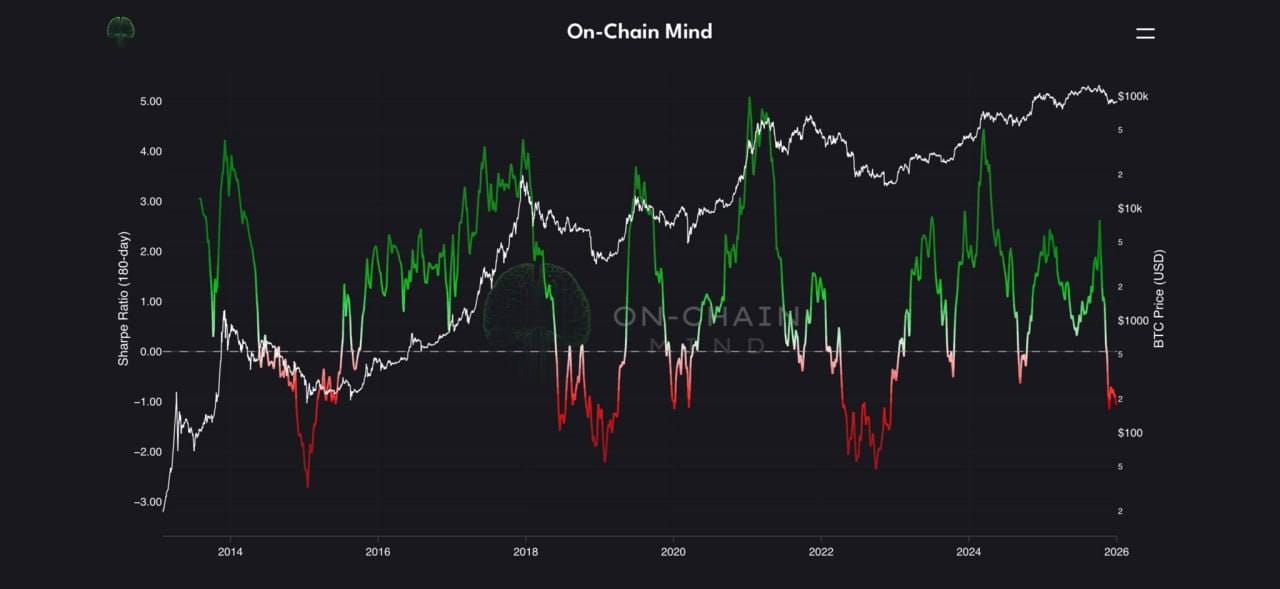 Сейчас Шарп находится в глубоко отрицательной зоне. Это означает высокую волатильность при слабой доходности. Исторически такие фазы возникают в периоды сильного стресса и капитуляционных настроений. В прошлом именно такие зоны часто совпадали с благоприятными периодами для долгосрочного накопления, а не для активной торговли.