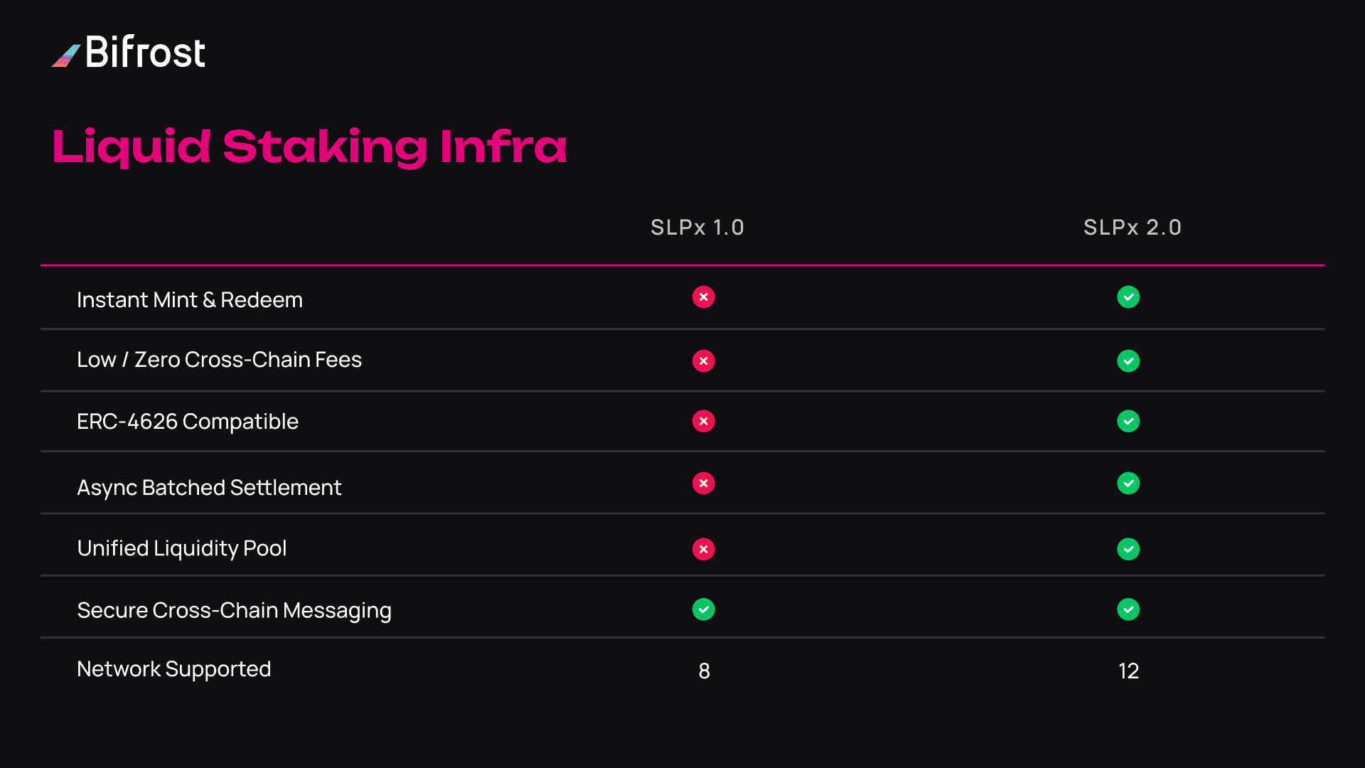 Основное обновление происходит благодаря SLPx 2.0. Принимая асинхронную модель пула и стандарт хранилища ERC 4626, Bifrost устраняет многие неудобства, присущие предыдущим системам кросс-чейн стейкинга. Майнтинг происходит мгновенно, выкупы происходят быстрее и группируются, а комиссии значительно снижаются, поскольку межцепочечные операции выполняются в фоновом режиме, а не на каждую транзакцию.