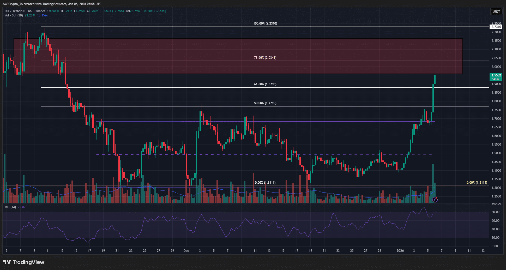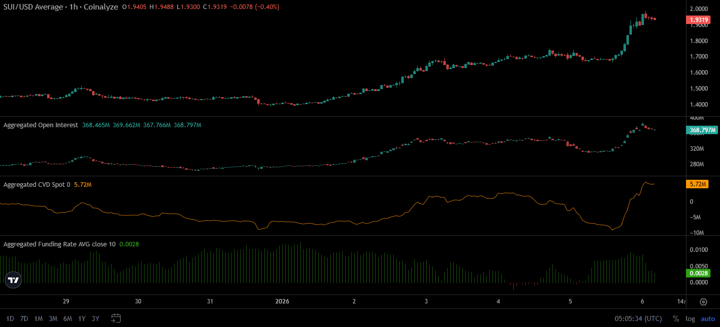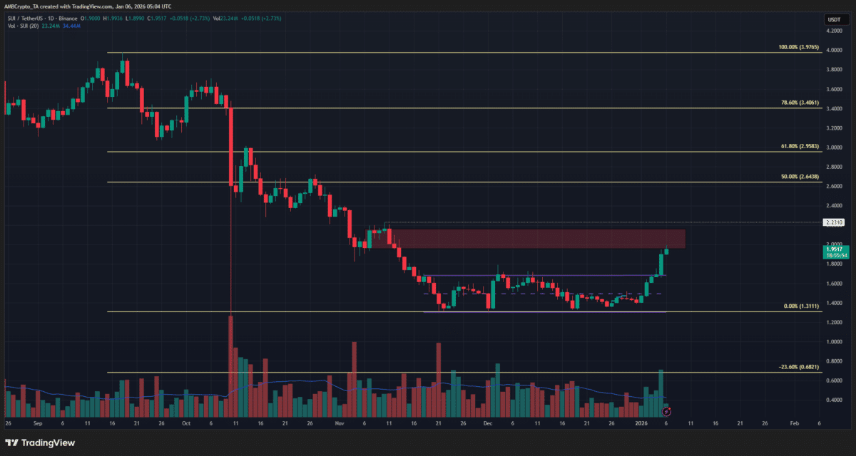 1 января SUI упал до минимума в 1,39 доллара США, а затем отскочил. За чуть более чем пять дней токен вырос на 39,95%, достигнув 1,95 доллара США. В процессе он вырвался выше диапазона 1,30–1,68 доллара США, выделенного в другом отчете.