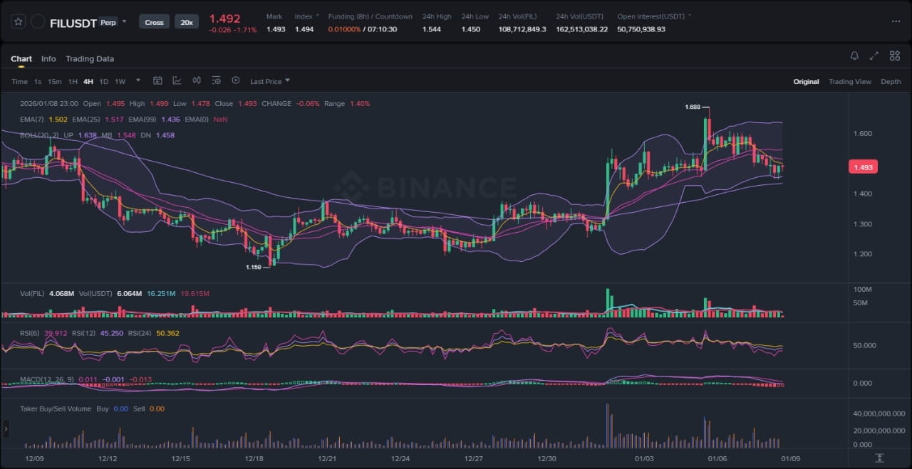 Криптовалютный рынок пережил скромный откат на первой неделе января 2026 года, при этом Bitcoin и Ethereum возглавляют коррекцию от максимумов в конце года на фоне фиксации прибыли и макроэкономической неопределенности. Filecoin, как утилитарный токен, связанный с спросом на децентрализованное хранение, отражает это более широкое настроение, но демонстрирует уникальную устойчивость через повышенную торговую активность. За последние 72 часа цена FIL колебалась между $1.52 и $1.60, отражая фазу консолидации в рамках более крупного нисходящего тренда, который начался в конце декабря. Эта структура в диапазоне предполагает накопление или распределение, в зависимости от подтверждения объема, поскольку токен сталкивается с ликвидными карманами вокруг ключевых уровней коррекции Фибоначчи от ноябрьского ралли. Общая рыночная капитализация альткойнов, таких как FIL, остается под давлением, но интерес к решениям по хранению в секторе — подстегиваемый AI и данными, требующими много ресурсов — предоставляет контр-нарратив к макроотступлению.