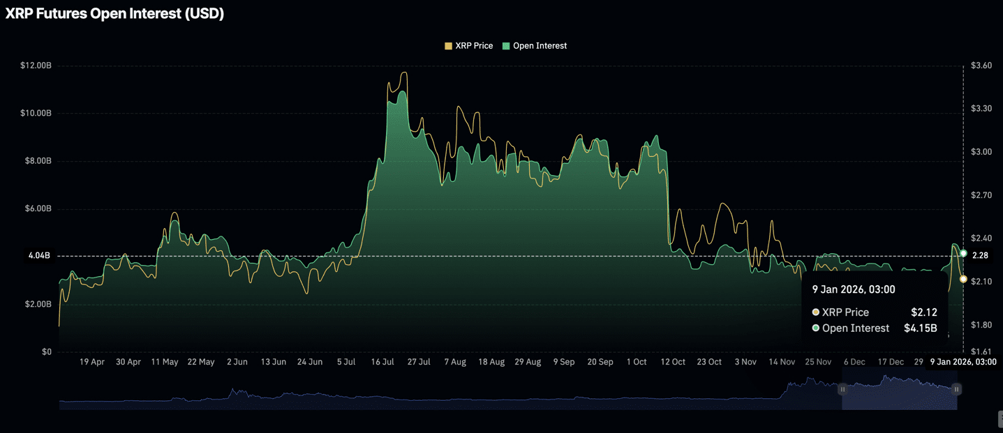 XRP сталкивается с сокращением спроса со стороны розничных инвесторов, что подтверждается снижением открытого интереса по фьючерсам, упавшим до 4,15 млрд долларов.