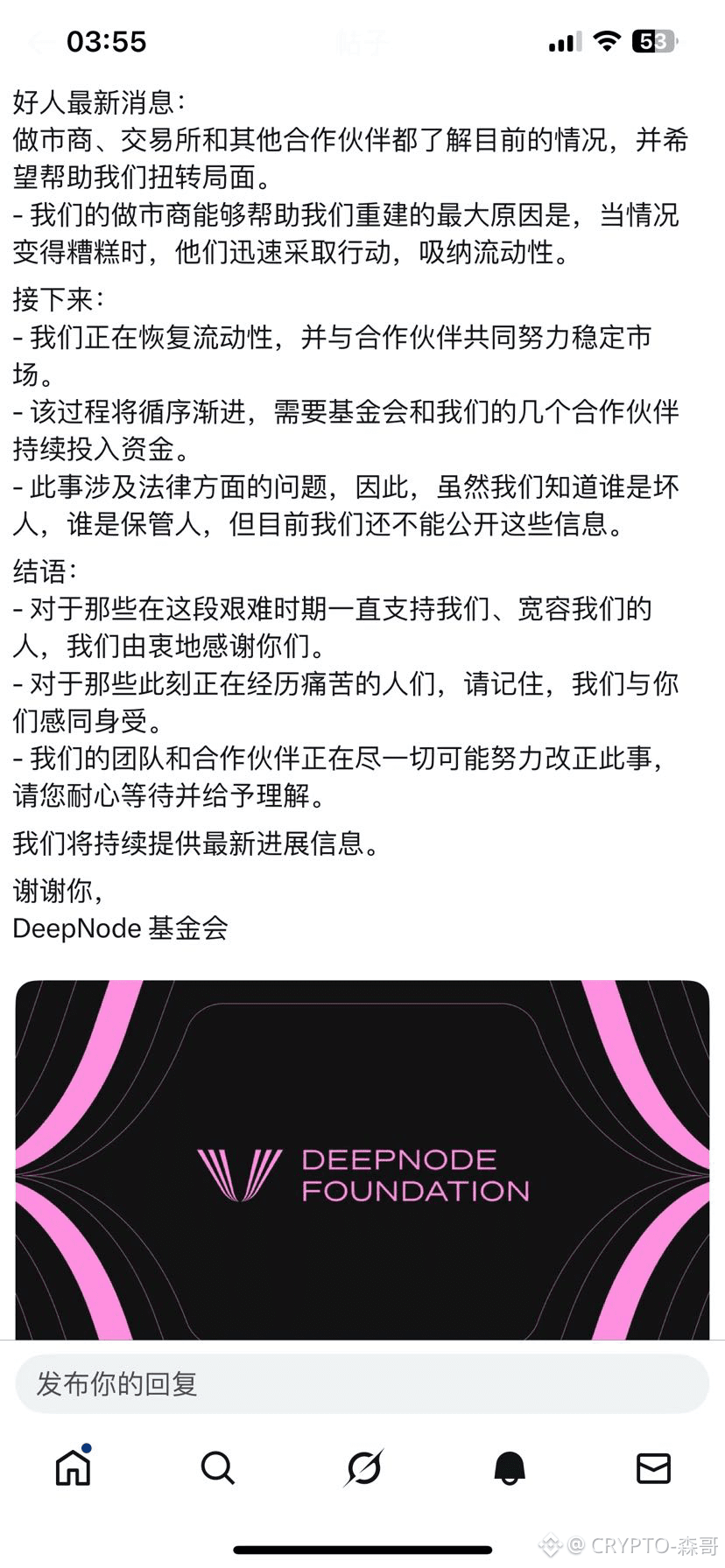 $DN 关于DeepNode代币暴跌的最新进展:DeepNode基金会于今日凌晨在X平台发文,已然将该事件的来龙去脉调查清楚,后续的计划也为投资者和项目前景增添信心,加油吧DN大牛,希望项目方领导层继续为回补和恢复项目和社区的工作而努力💪,希望DN大牛越来越好🚀🚀