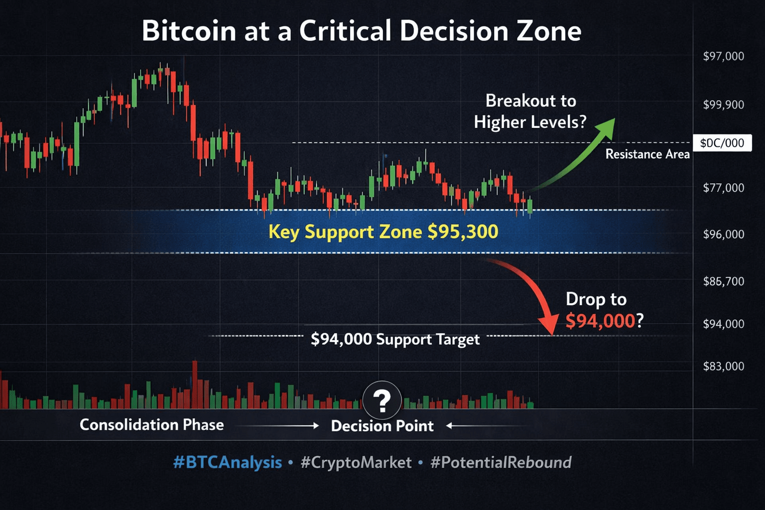 $BTC сейчас движется в очень критической зоне. После недавнего падения с области $97K до $94K, цена в настоящее время колеблется около $95.3K, показывая четкие признаки консолидации.