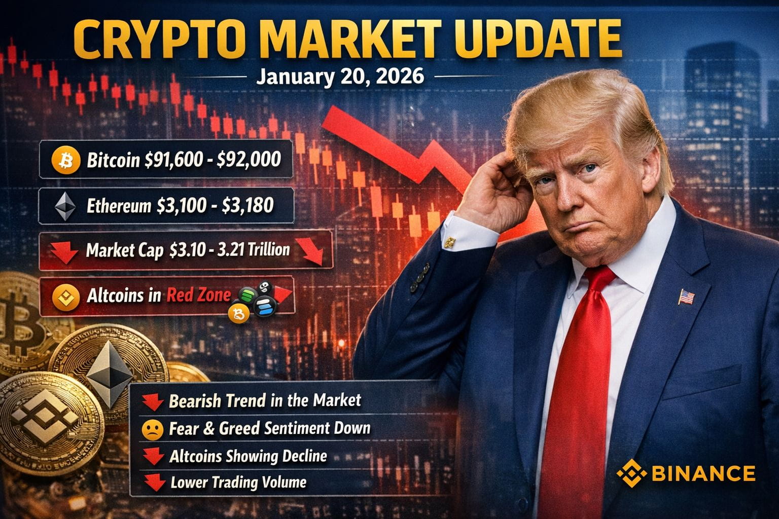 Сегодня, 20 января 2026 года, глобальный крипторынок испытывает медвежью тенденцию с основными цифровыми валютами, торгующимися в более низком диапазоне, что приводит к уменьшению общей рыночной капитализации.