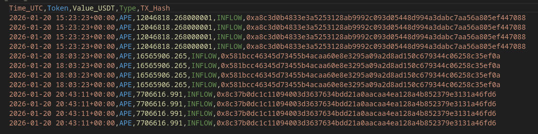 Вывод: Это не похоже на случайность. Кто-то активно "заводит" токены на биржу. Обычно массовый Inflow свидетельствует о желании продать (фиксация прибыли) или о подготовке к большому маркет-мейкингу. Ожидайте повышенной волатильности по APE.