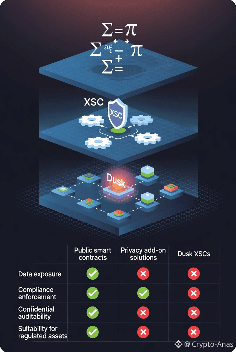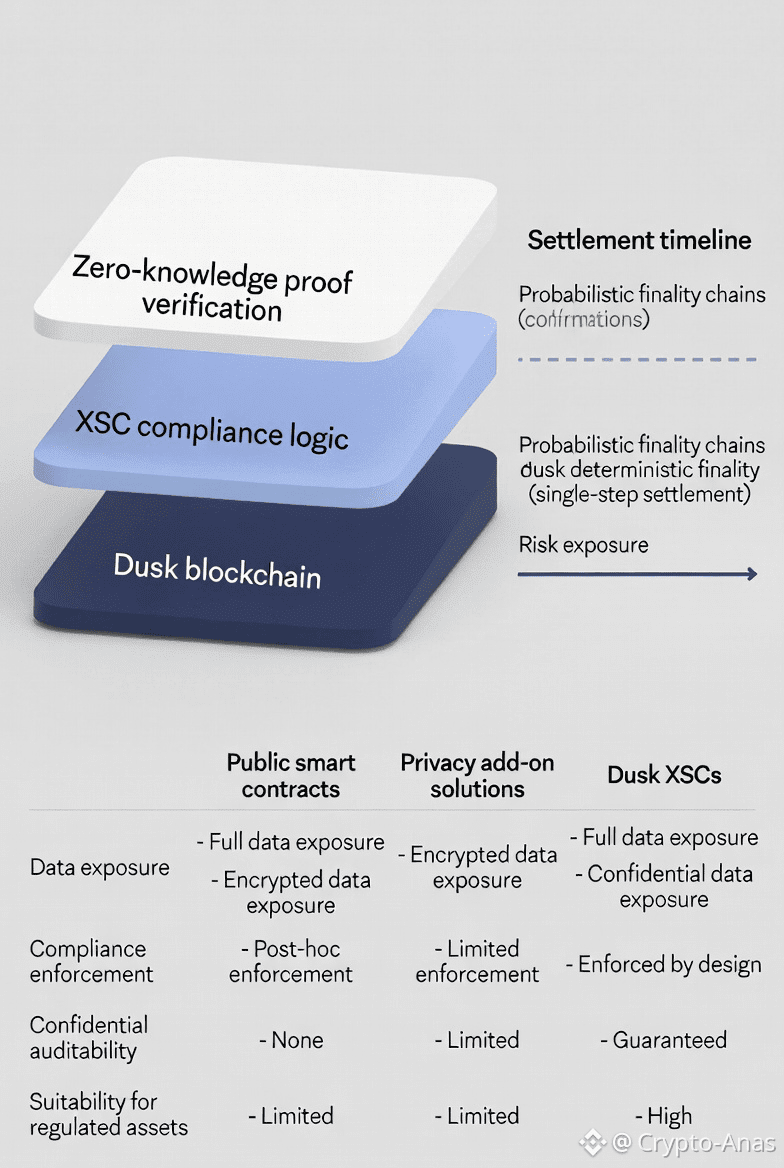 XSCs are not generic smart contracts with privacy added later. They are native Dusk primitives that combine zero-knowledge verification, programmable compliance, and deterministic settlement. Regulatory rules such as transfer restrictions, whitelisting, and disclosure logic are enforced automatically, while transaction details remain confidential. This allows compliance to be proven cryptographically instead of revealed publicly.