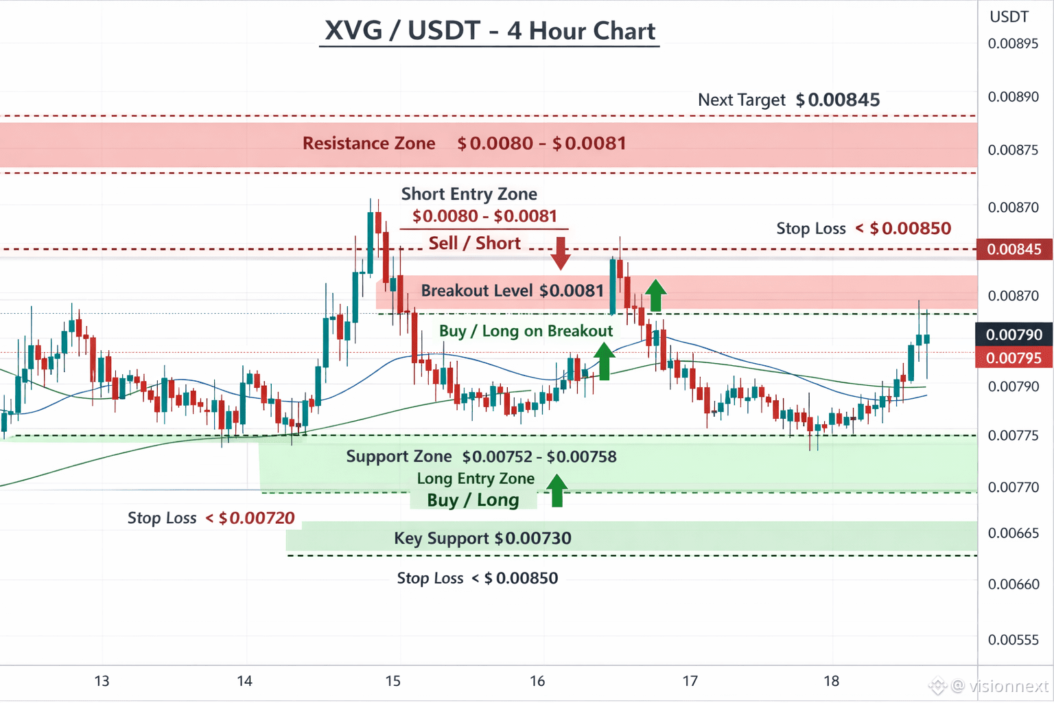 Here’s a precise, 4-hour timeframe analysis for $XVG USDT$XVG USDT (price ≈ $0.0079) with support & resistance levels plus entry/exit guidance in 10 clear lines: