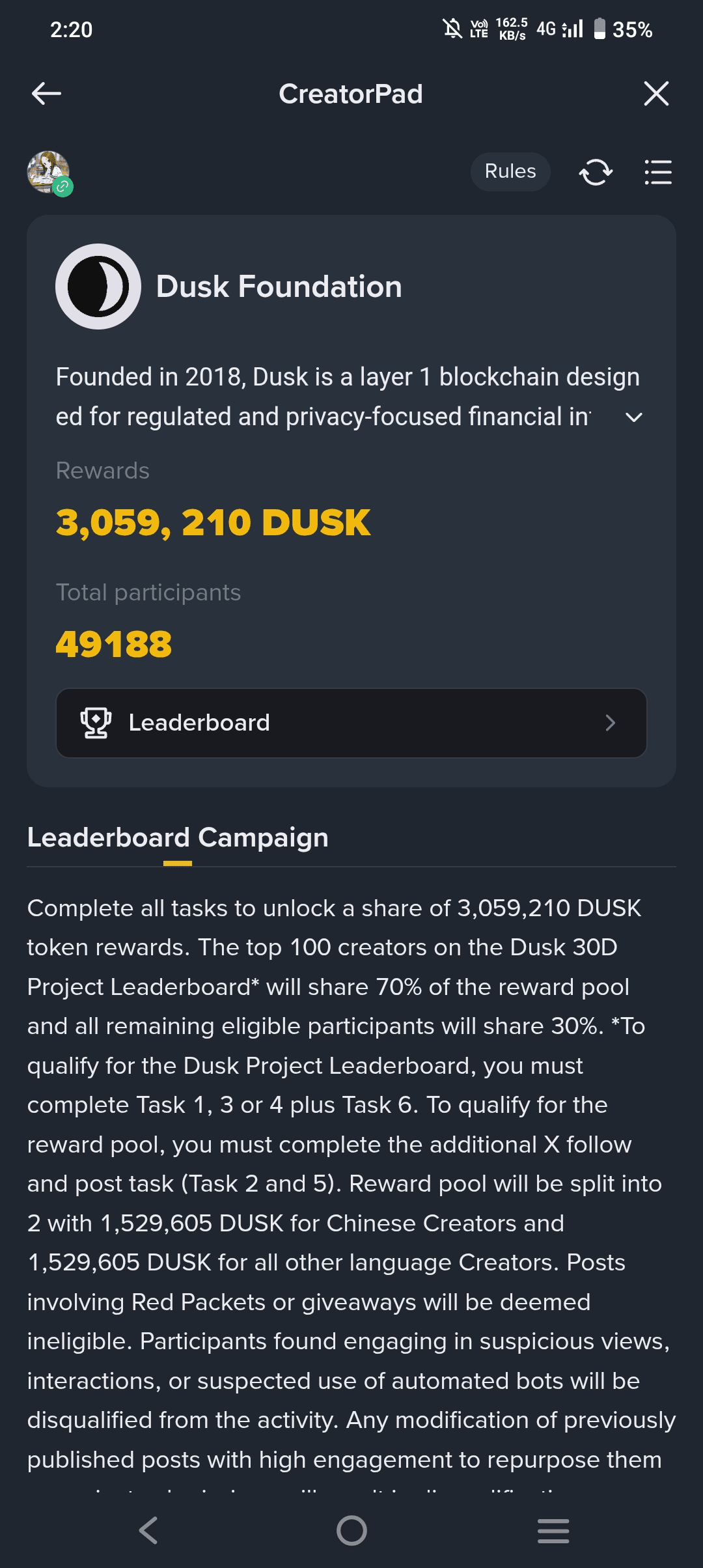 Завершите все задания, чтобы разблокировать долю в 3,059,210 токенов DUSK в виде вознаграждений. Топ-100 создателей на лидерборде проекта Dusk 30D* поделятся 70% пула вознаграждений, а все остальные подходящие участники поделятся 30%. *Чтобы квалифицироваться для лидерборда проекта Dusk, вы должны выполнить Задание 1, 3 или 4 плюс Задание 6. Чтобы квалифицироваться для пула вознаграждений, вы должны выполнить дополнительные задания по подписке и публикации (Задания 2 и 5). Пул вознаграждений будет разделен на 2 части: 1,529,605 DUSK для китайских создателей и 1,529,605 DUSK для создателей на других языках. Публикации, касающиеся Красных Пакетов или розыгрышей, будут считаться неподходящими. Участники, замеченные в подозрительных просмотрах, взаимодействиях или подозрительном использовании автоматизированных ботов, будут дисквалифицированы. Любые изменения ранее опубликованных постов с высоким уровнем вовлеченности с целью их повторного использования в качестве заявок на проект приведут к дисквалификации. Вознаграждения будут распределены до 2026-02-28 в Хабе вознаграждений.