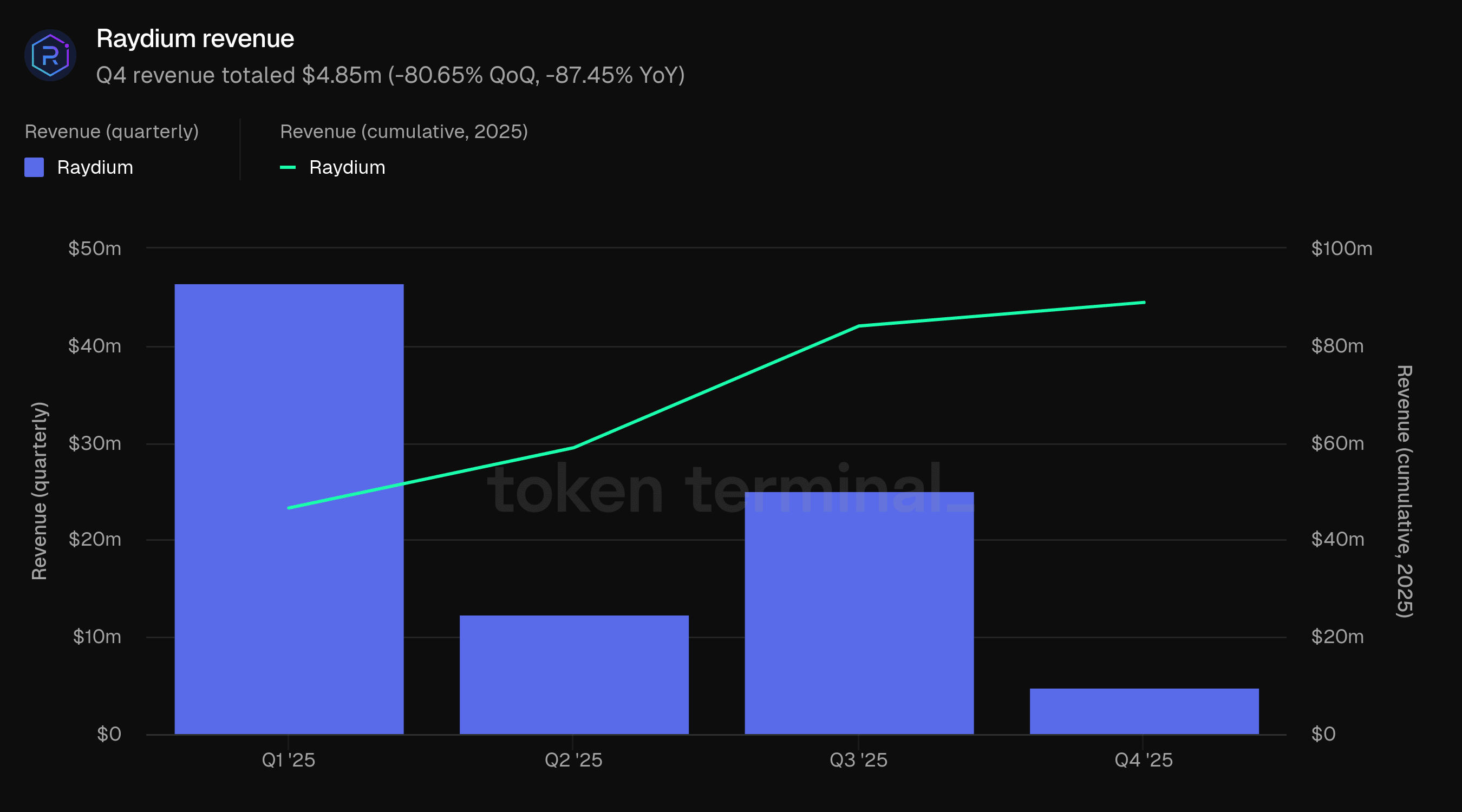 В Q4 2025 ключевые метрики Raydium снизились как по сравнению с Q3 2025, так и с уровнями Q4 2024 года, отражая более широкий замедление активности экосистемы Solana после сильных первых трех кварталов года. TVL упал примерно на 30% как в квартальном, так и в годовом исчислении, в то время как объем торговли, сборы, доход и MAU показали более резкие снижения в годовом исчислении, поскольку активность мемкоинов нормализовалась с пиковых уровней Q4 2024 года.