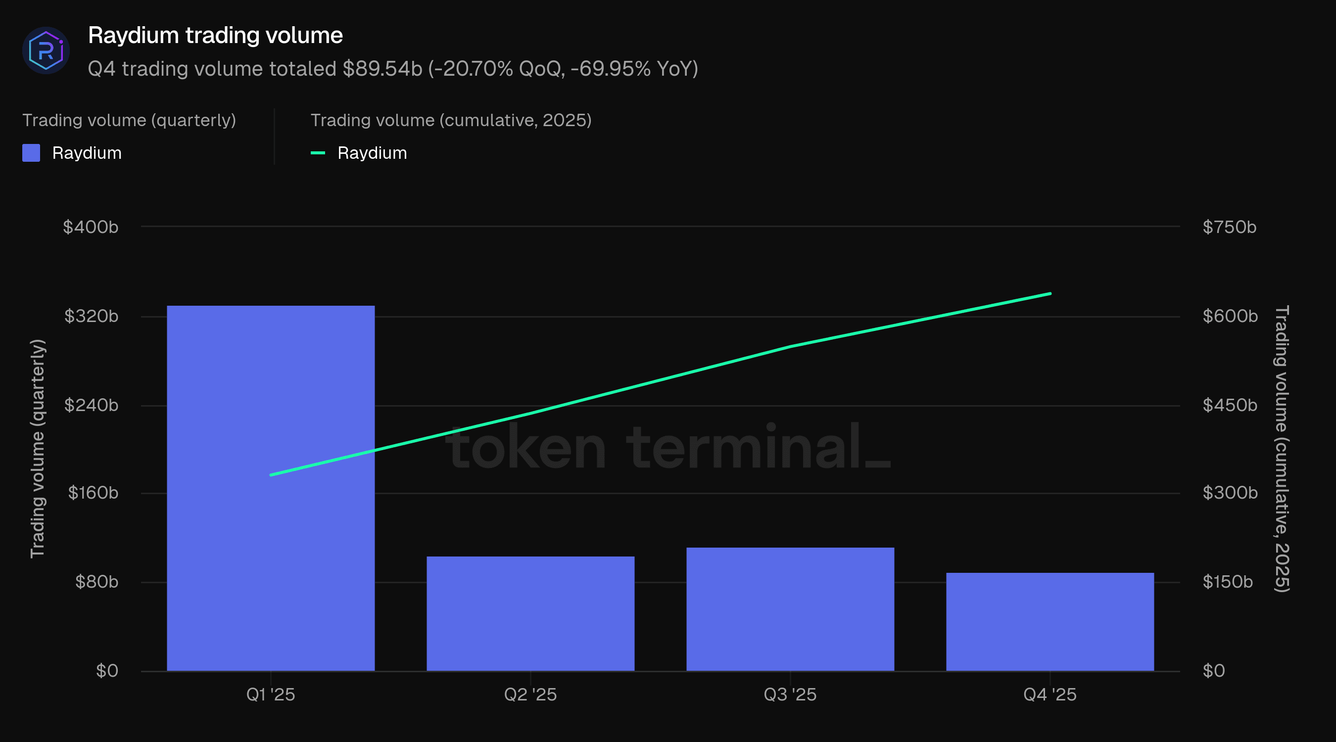 Этот отчет публикуется ежеквартально и составляется с использованием инфраструктуры данных Token Terminal. Все метрики получены непосредственно из данных блокчейна. Графики и наборы данных, упомянутые в этом отчете, могут быть просмотрены на соответствующей панели отчетов Raydium Q4 2025 на Token Terminal.
