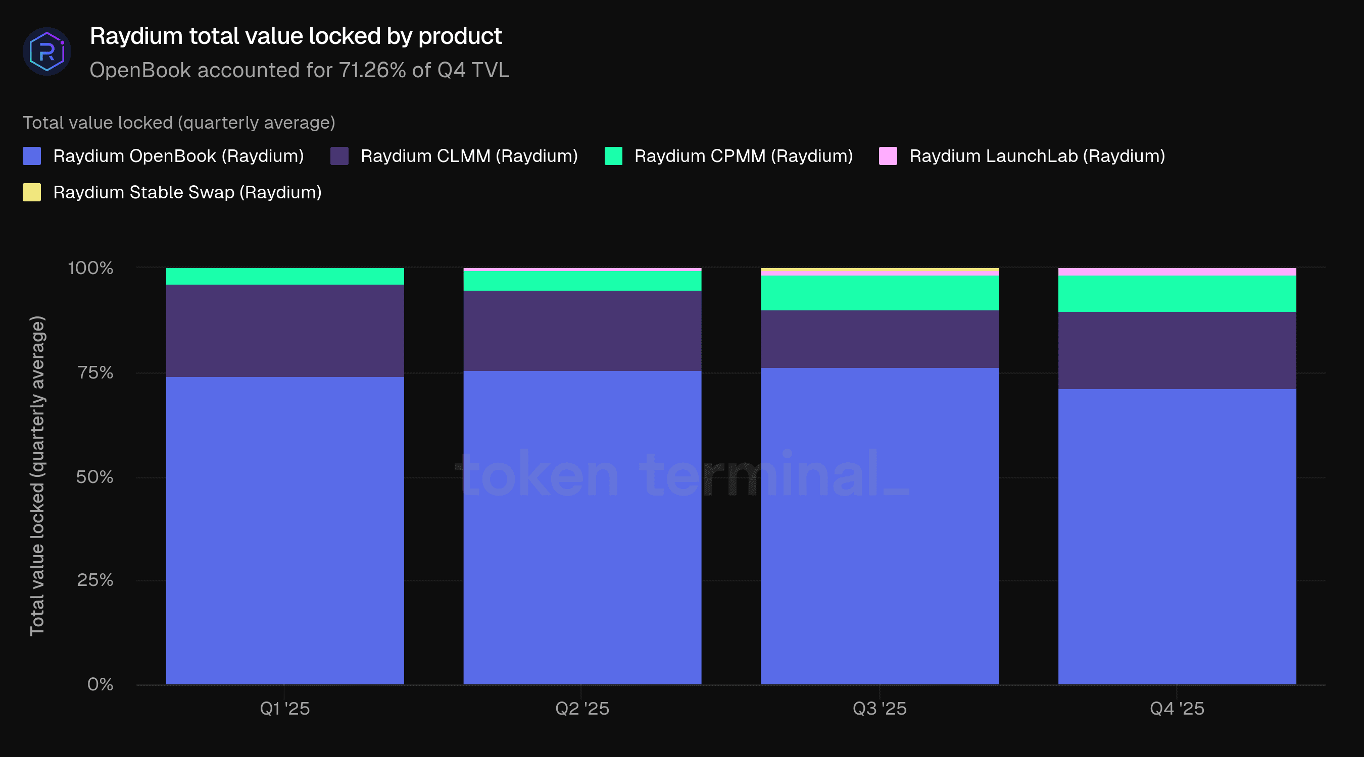 Сборы измеряют общую стоимость сборов в долларах США, уплаченных пользователями через торговые продукты Raydium. Сборы Q4 составили 33,31 миллиона долларов, что на 79,03% меньше, чем в Q3 (158,89 миллиона долларов), и на 95,48% меньше, чем в Q4 2024 года (737,54 миллиона долларов). CLMM составил 59,20% от сборов Q4, за ним следовали OpenBook с 18,56%, CPMM с 17,43% и LaunchLab с 4,81%.