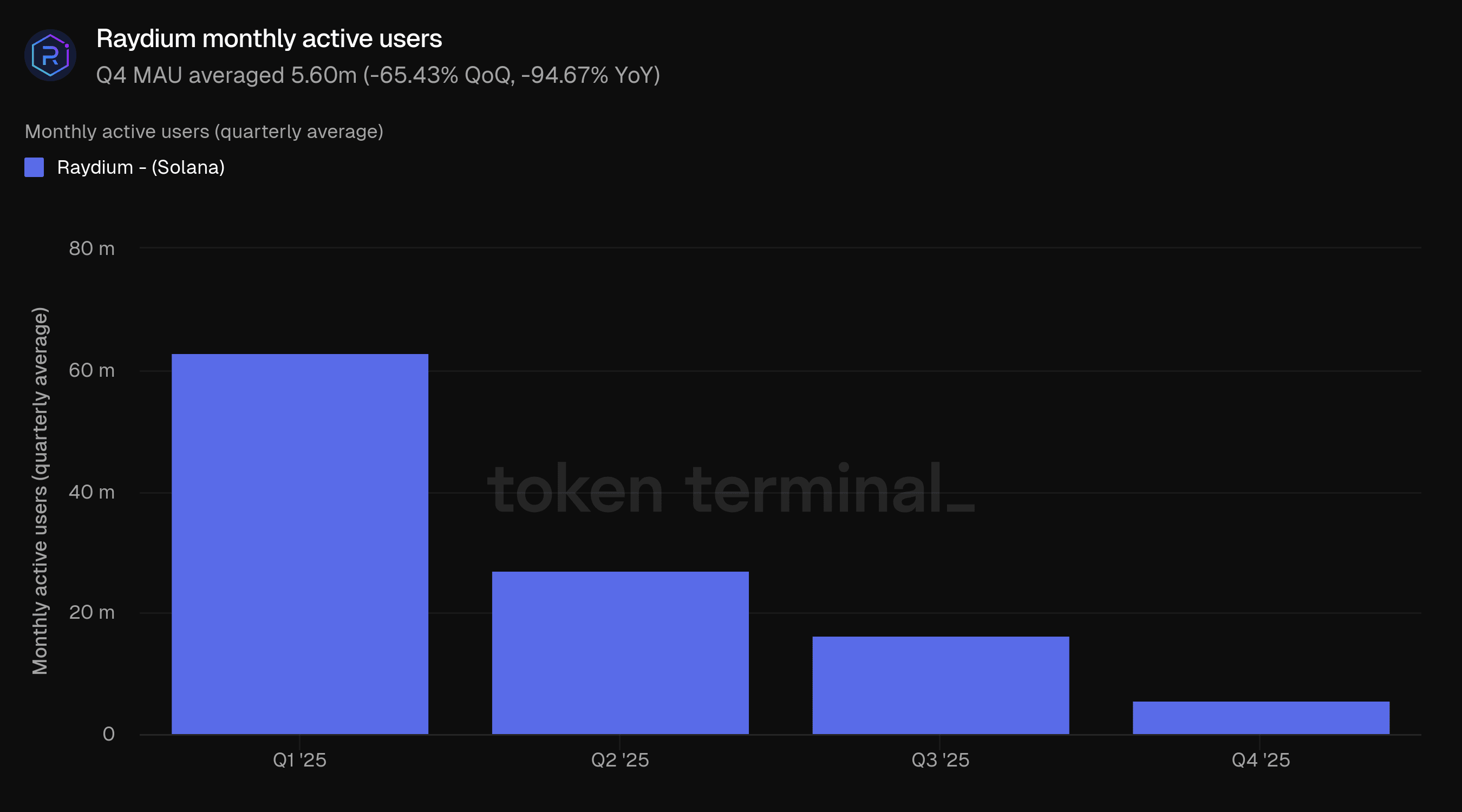 Ежемесячные активные пользователи (MAU) измеряют количество уникальных пользователей, которые совершили хотя бы одну торговлю на Raydium в течение скользящего 30-дневного периода. Среднее значение MAU в Q4 составило 5,60 миллиона, что на 65,43% меньше, чем в Q3 (16,20 миллиона), и на 94,67% меньше, чем в Q4 2024 года (105,1 миллиона). Несмотря на снижение числа пользователей, Raydium укрепил свою позицию в экосистеме DEX Solana, захватив 50,06% рыночной доли объема торговли в Q4, увеличившись с 48,89% в Q3.