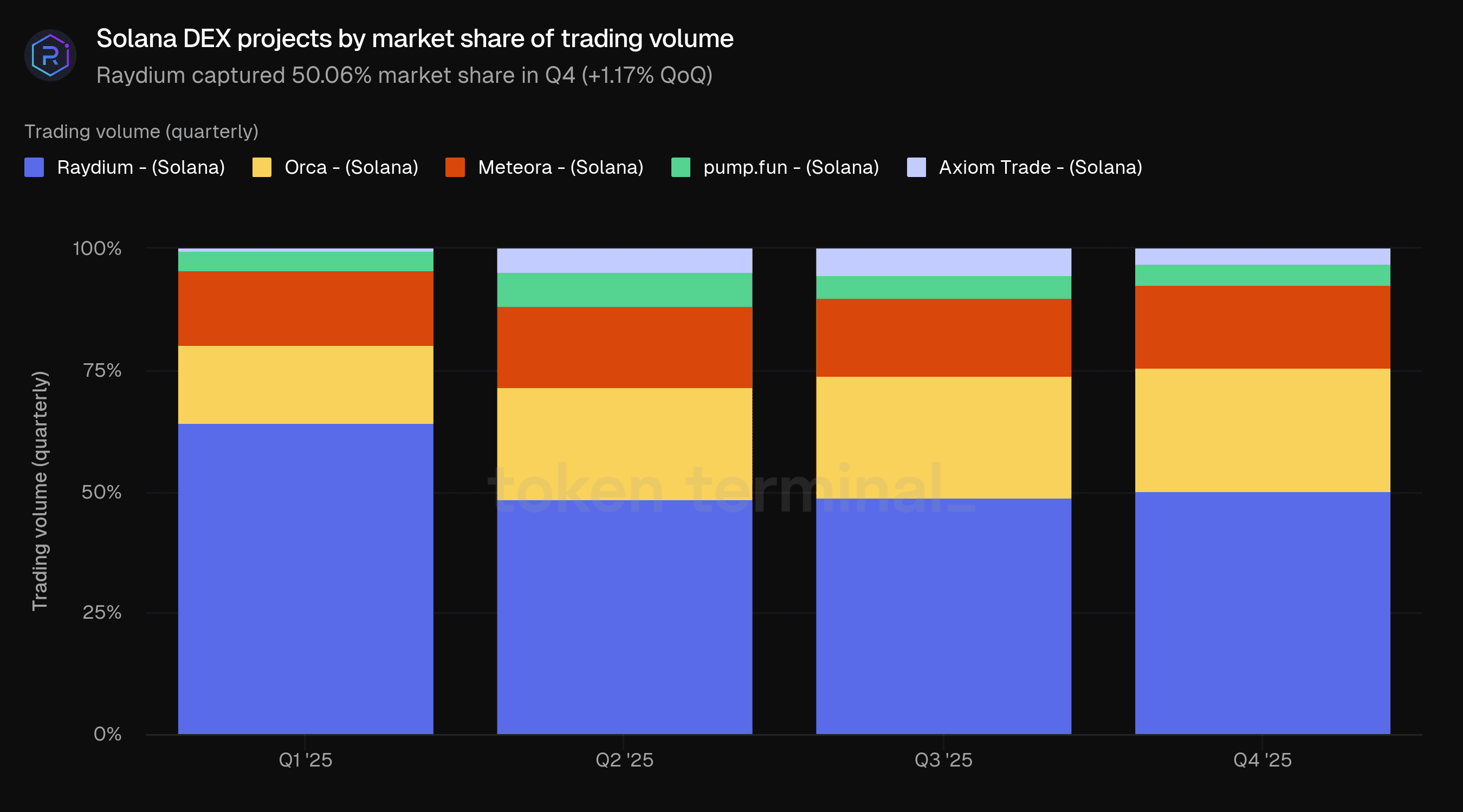 "Q4 2025 стал периодом консолидации на рынке после исключительных первых трех кварталов года. Хотя основные метрики отражали сезонность более широкой экосистемы Solana и подавленные цены на активы, Raydium сохранил свою конкурентоспособную позицию. Raydium даже занял позицию ясного лидера в ключевых вертикалях, таких как токенизированный капитал, с долей рынка 54%, удвоив следующего конкурента.