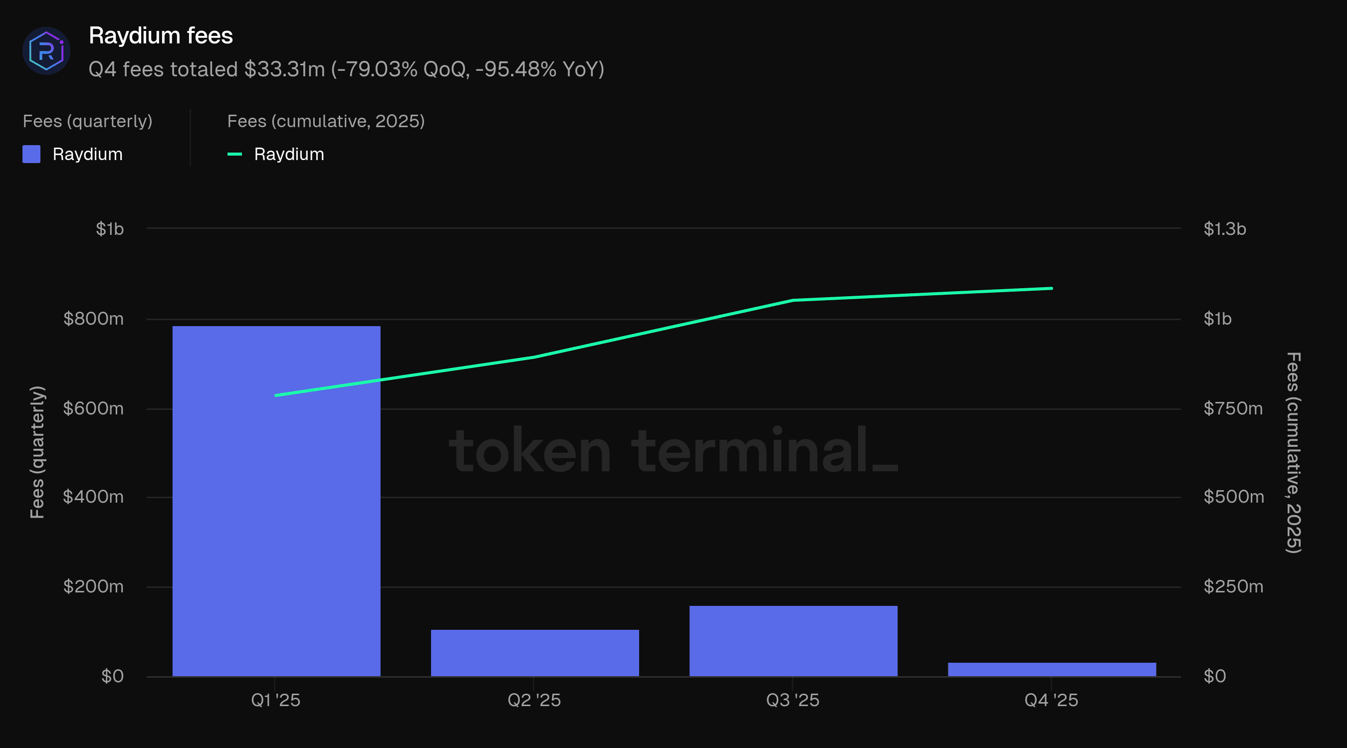"Сборы Q4 составили 33,31 миллиона долларов, отражая значительное снижение активности мемкоинов, которое характеризовало более широкий экосистему Solana в четвертом квартале. Падение было наиболее выражено в LaunchLab, который ранее способствовал исключительному росту сборов в Q3, но нормализовался на фоне сокращения активности запуска токенов в экосистеме."