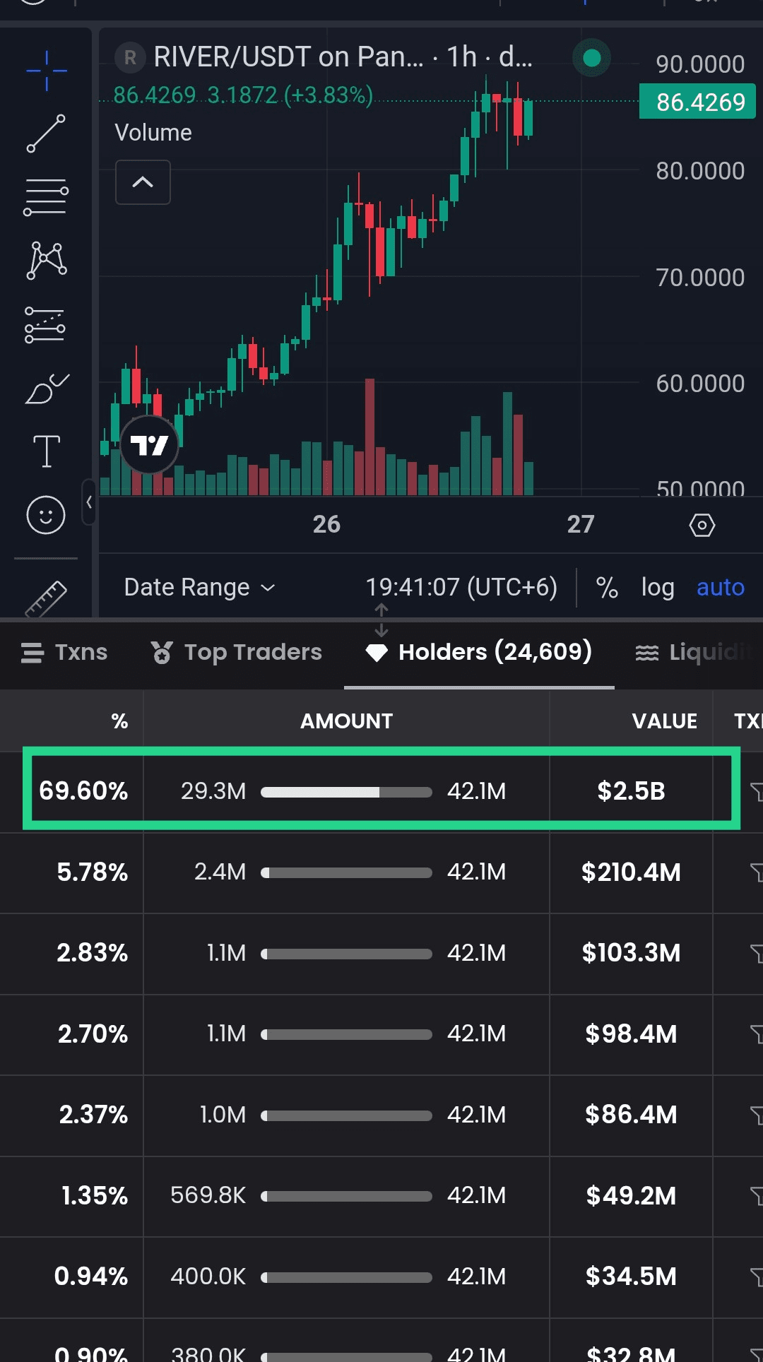 Один держатель владеет 69% $RIVER , и они не продадут так легко. В настоящее время у них в кошельке $2.5B в $River.