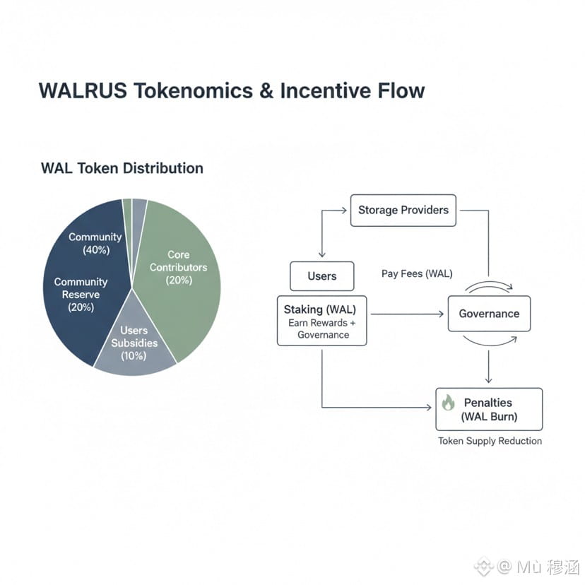 The WAL token is positioned as a coordination and accountability mechanism rather than a purely speculative asset. Users pay for storage in WAL, while providers stake tokens to signal commitment. Misbehavior, such as failing to store fragments, can trigger penalties through token burning. Governance decisions related to protocol upgrades and system parameters are also mediated through token voting. The supply is structured across community reserves, early users, development incentives, core contributors, and investors, with long vesting schedules to smooth distribution over time.