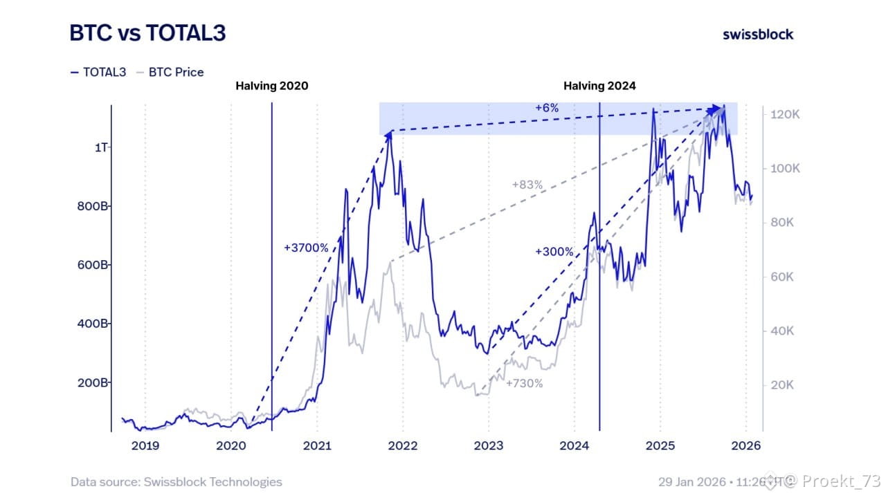 - #BTC уже +83% выше прошлого максимума цикла, а TOTAL3 - всего +6%.
