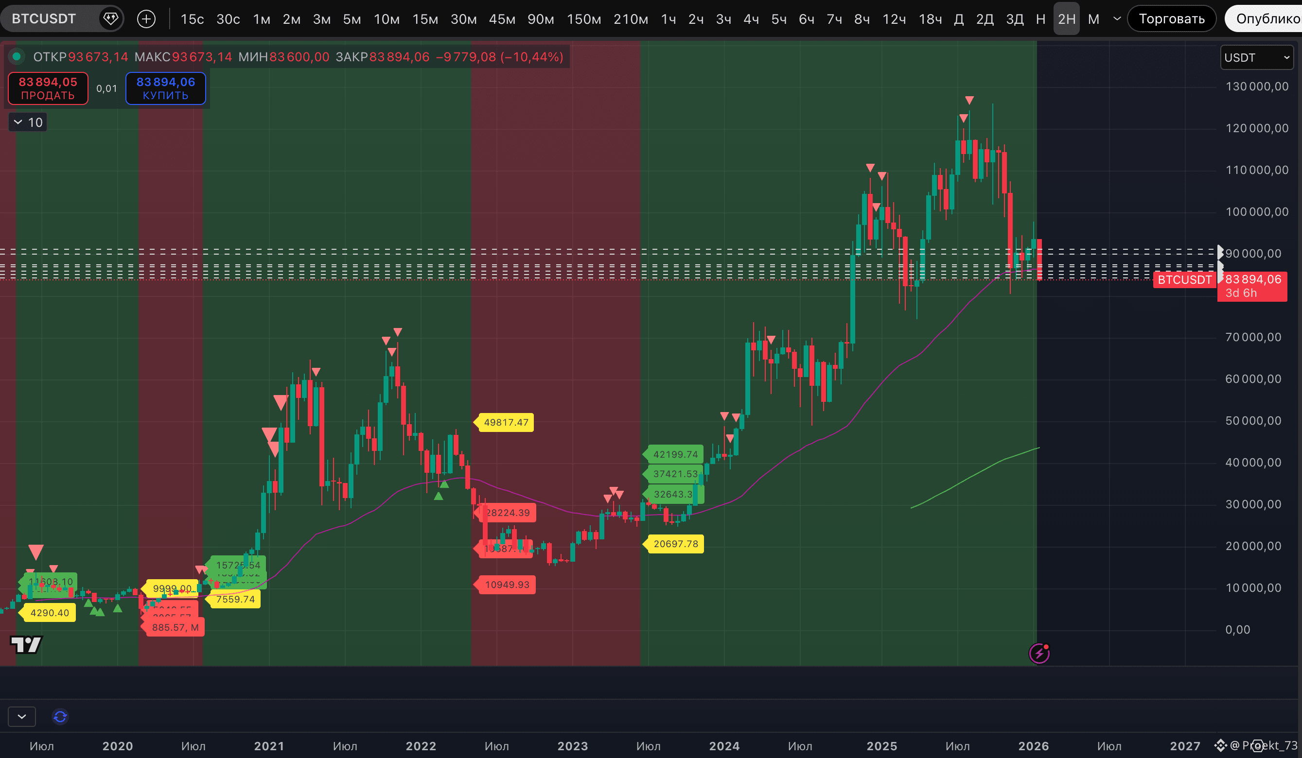 Стоит дождаться закрытия недели. Если получим даунтренд на 2-недельном ТФ - для BTC это откроет путь в сторону, ориентировочно, крайней базовой цели 56 000$ по нашему индикатору. И главной надеждой для альткоинов станет развитие отскока перед этим возможным (!) снижением.