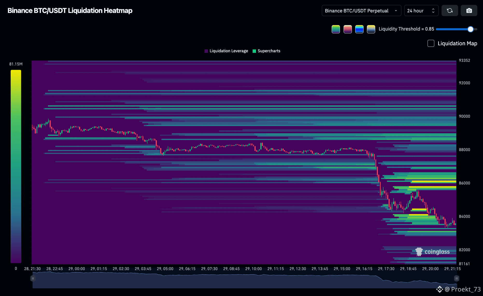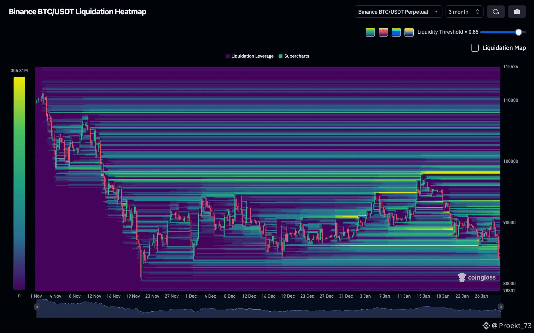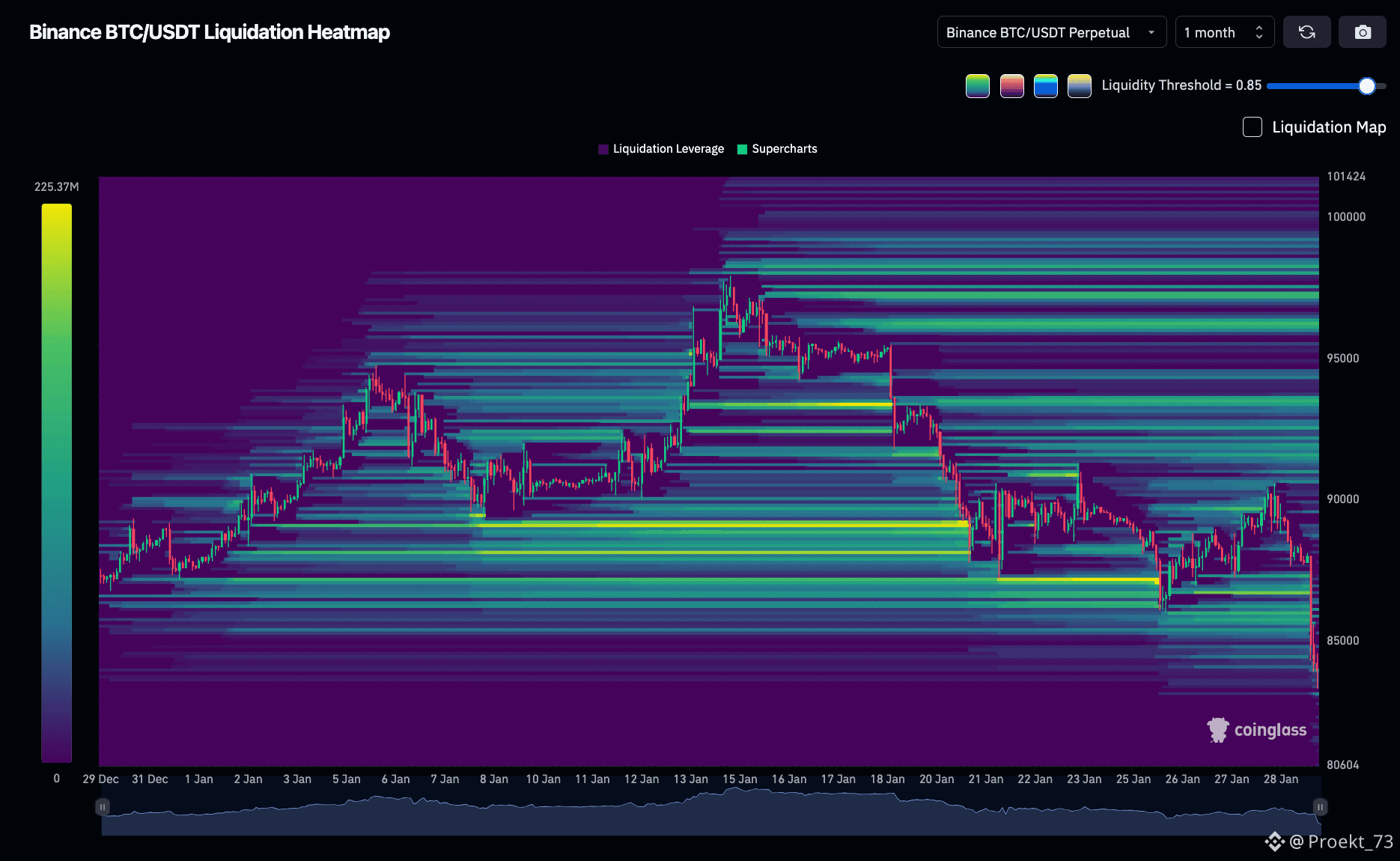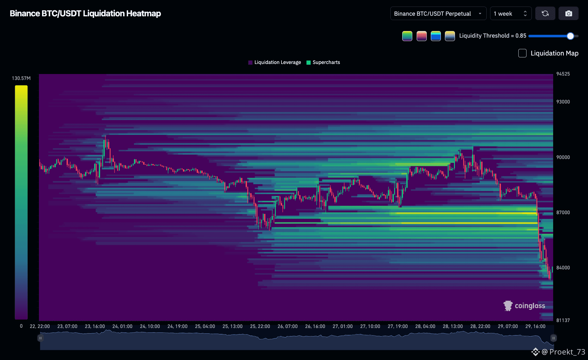 Тепловая карта ликвидности BTC на Binance, самые яркие уровни: