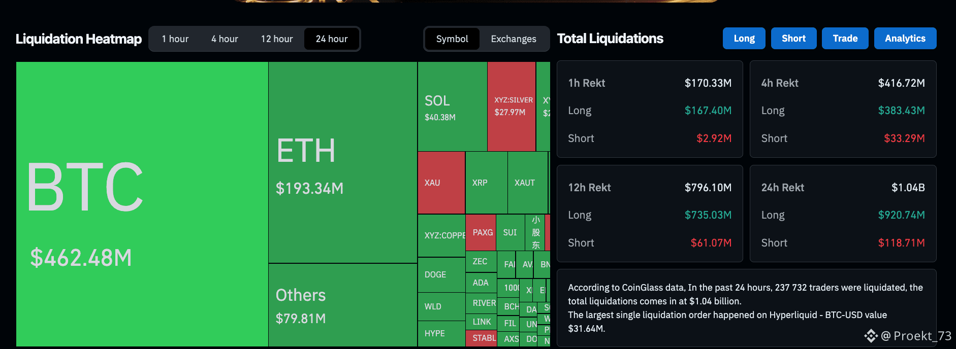 По данным #Coinglass видно, что больше всего пострадали лонгующие #BTC - потерь на 462,48 млн $.