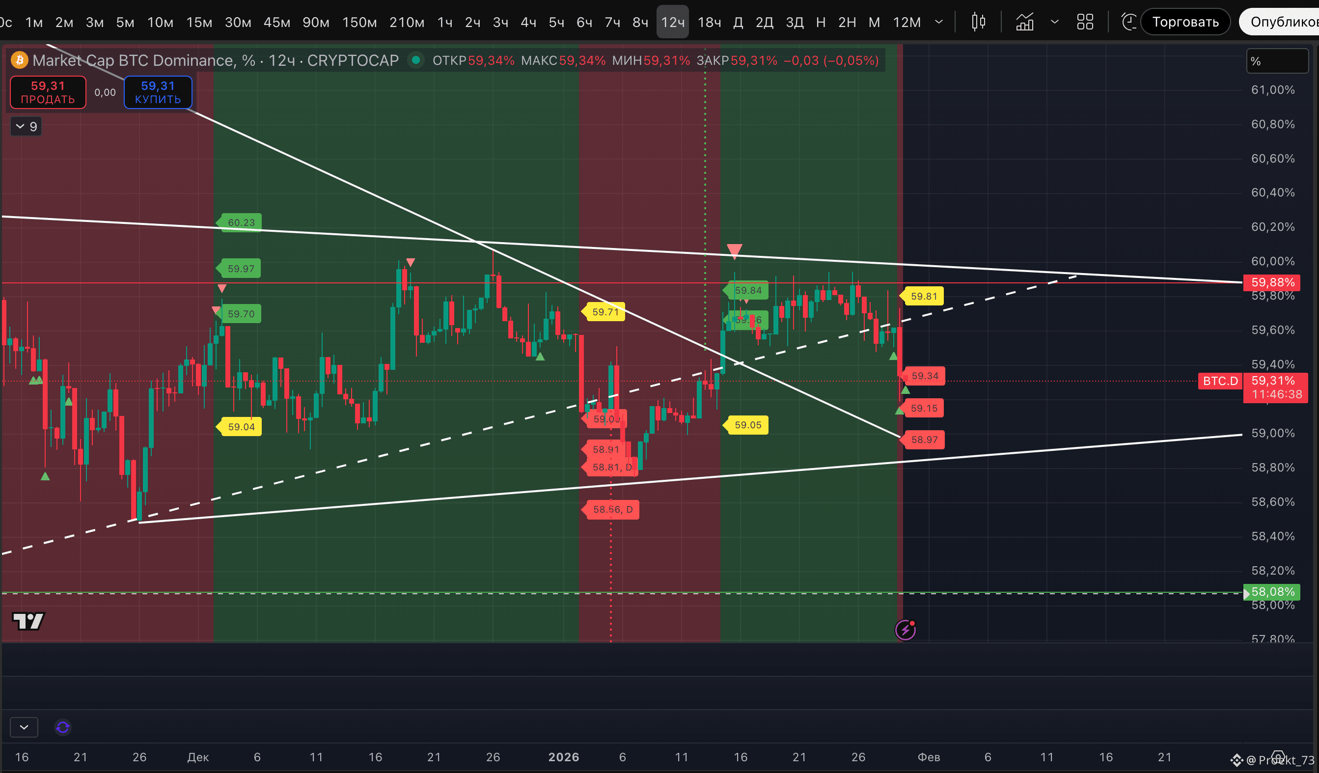Доминация BTC держится ниже важного уровня 59,88% и перешла в устойчивый даунтренд на 12-часовом ТФ. Еще не достигнутые базовые цели - 59,15%, 58,97%. Уровень потенциального слома - 59,81%.