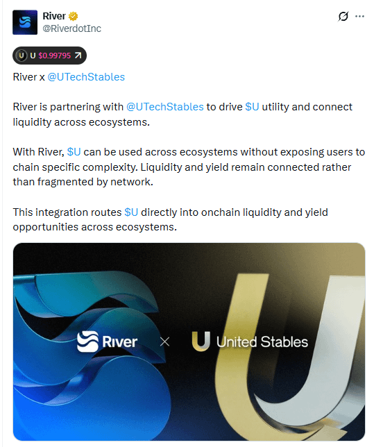 Интеграция работает, направляя U непосредственно в ликвидность и возможности дохода на цепочке в разных экосистемах. Трейдеры, разработчики и учреждения могут использовать U для кредитования, заимствования, стекинга или стратегий дохода, не требуя управления фрагментированными балансами вручную. River обрабатывает кросс-цепочную инфраструктуру незаметно, позволяя пользователям сосредоточиться на возможностях, а не на механике сети.