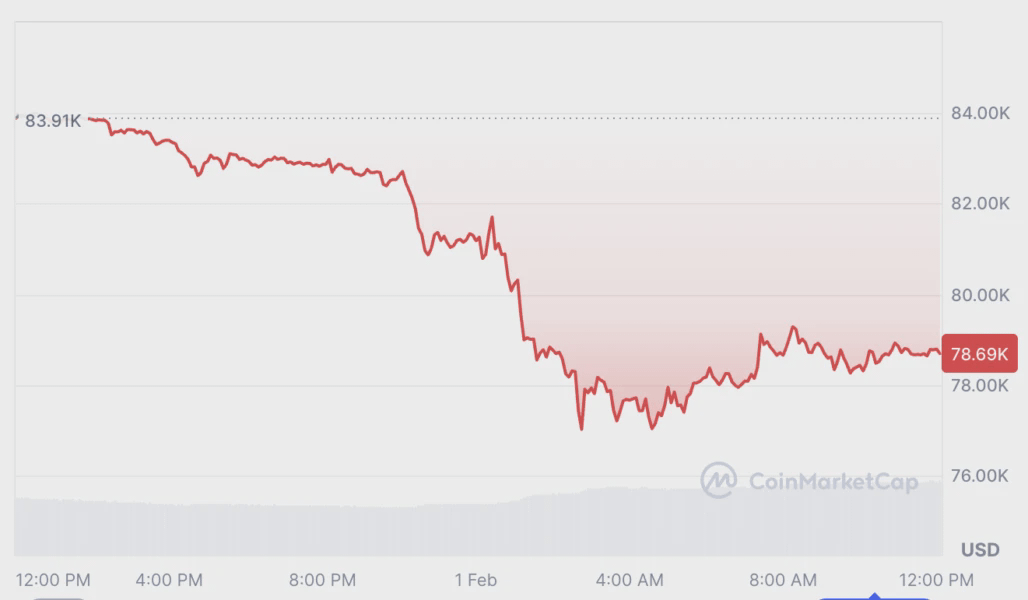 Биткойн упал на 7% до примерно $77,000 в субботу и с тех пор немного поднялся до $78,690 на момент публикации, согласно CoinMarketCap.